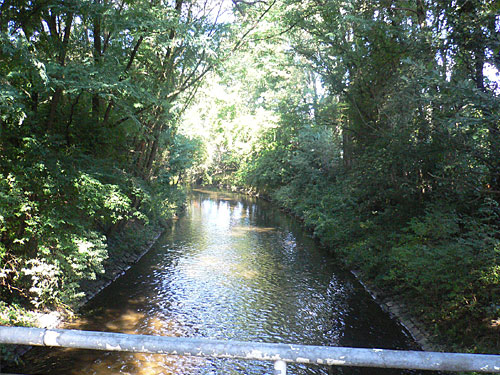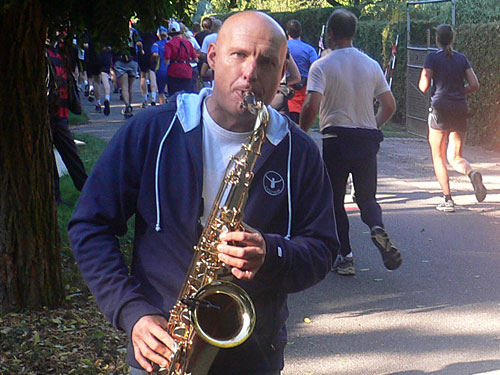 Gleich nach km 10 wird wieder die Autobahn überquert und es geht in den Tierpark Oberwald, den wir auf einem guten, asphaltierten Radweg durchlaufen. Vereinzelt stehen Leute am Weg, die uns anfeuern. Bei Kilometer 12 erreichen wir kurz vor Rüppurr eine Kleingartenanlage, wo uns ein Mann mit seinem Saxophon empfängt. Danach super Stimmung bei der großen Fangruppe und bevor es bei Kilometer 13 steil auf eine Brücke geht, feuern uns wieder viele Menschen lautstark an.