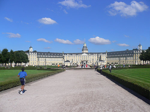 Bei km 34 sind wir auf der Hans-Thoma-Straße, passieren die Orangerie und die Staatliche Kunsthalle und laufen dann links direkt auf das 1715 erbaute Karlsruher Schloss zu. 200 Jahre war es Regierungssitz des Badischen Herrscherhauses.