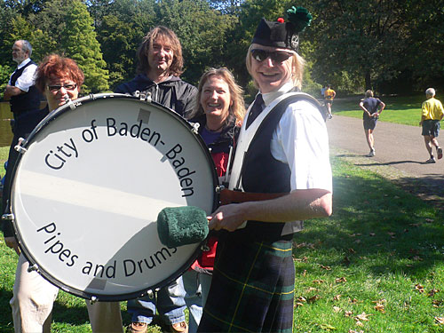 Die Lokale bewirten ihre zahlreichen Gäste im Freien. Der Blick jetzt auf das Schloss ist einmalig schön. Gleich lerne ich auch die Rückseite kennen, denn in weitem Bogen geht es durch den Schlossgarten mit den alten Bäumen, Seen und gepflegten Grünanlagen. Die markanten Klänge aus einem Dudelsack machen mich hellwach. Ist mir der Mountain-Piper von der Eigermoräne nach Karlsruhe gefolgt? Nein, es ist die Gruppe „City of Baden-Baden Pipes and Drums“. Mir gefällt’s und vielen Zuschauern auch. Links sehe ich die Flutlichtmasten des Wildpark-Stadions.