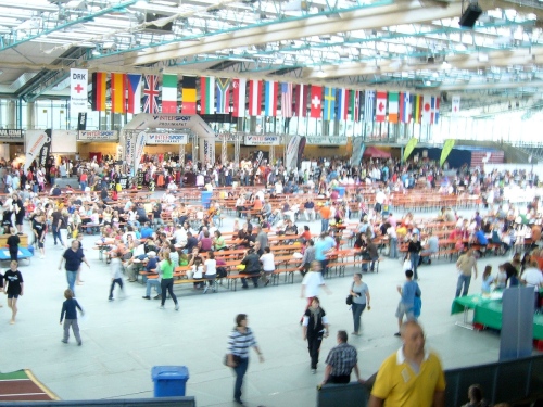 Nachdem wir uns einiges angesehen haben, geht es zur Europahalle. Die Halle befindet sich an der Alb, einem kleinen Nebenfluss des Rheins, und neben dem Beiertheimer Stadion, in dem der neue Zieleinlauf ist. Die Dachkonstruktion der Europahalle bietet  mit seiner Dachkonstruktion eine bauliche Besonderheit, weil sie lediglich von zwei Stahlseilen getragen wird. Innen bietet sie bis zu 9.000 Steh- und Sitzplätze - heute jedoch ist sie eine Kombination aus Messe und Festhalle. Wir holen die Startunterlagen, sammeln noch einige Flyer von Läufen in der ganzen Welt, essen Pasta (musste leider extra bezahlt werden), schlendern über die Messe und ruckzuck ist der Tag vorbei.