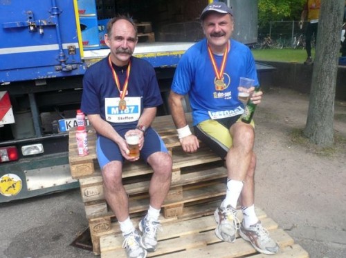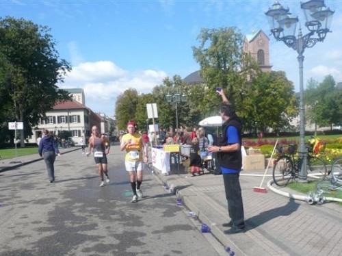 Die Karlsruher haben sich etwas einfallen lassen: Unter dem Titel „Culinaritäten zum Baden-Marathon“ beteiligen sich einige Gaststätten an einer außergewöhnlichen Pasta-Party. Für 5 € bekommt jeder Läufer einen Teller leckere Nudeln und ein Getränk in netter Restaurantatmosphäre. Sonst eher ein Fan von Pasta-Partys im Marathonzelt, bei denen man schnell ins Gespräch mit anderen Teilnehmern kommt, genieße ich heute die Ruhe. Mir gegenüber setzt sich ein freundlicher älterer Mitläufer und wir leisten uns eine Weile Gesellschaft. Er hat wenig trainiert und Knieprobleme, aber trotzdem will er sich den Lauf nicht nehmen lassen und nimmt es in Kauf, unter Schmerzen zu laufen. Ich wünsche ihm alles Gute, denke dabei an Klaus und hoffe, dass er bald wieder laufend unterwegs sein wird. Aber bitte ohne Schmerzen!