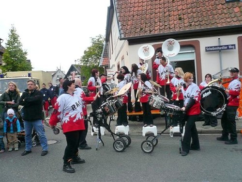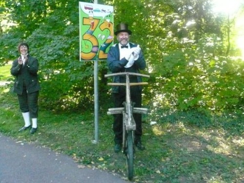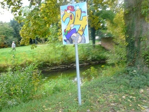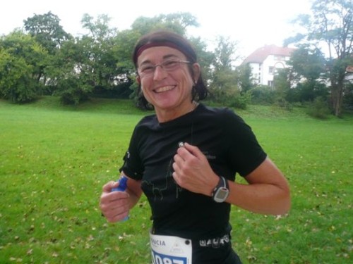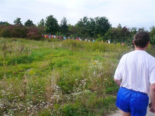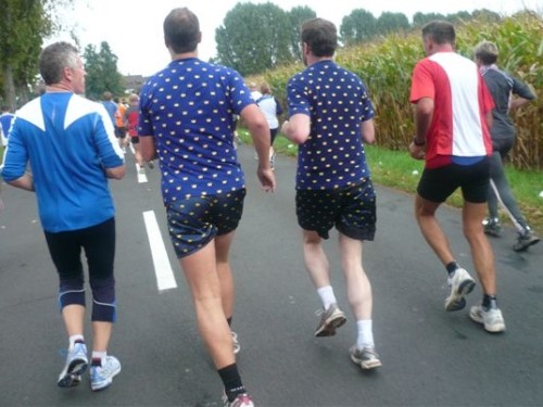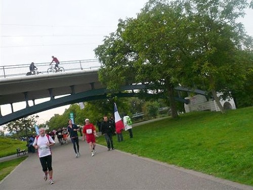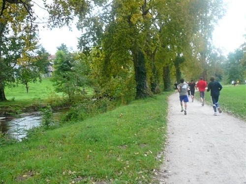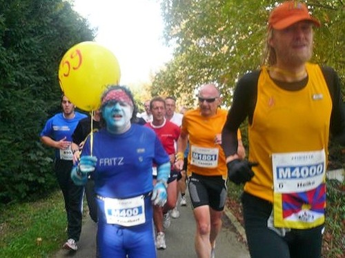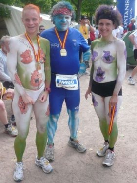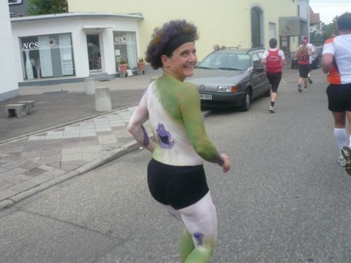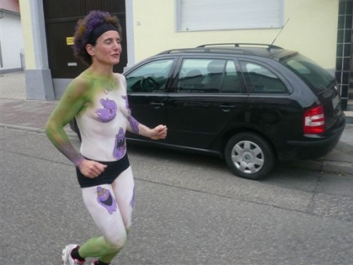 Zunächst bleibt es eine Weile schön grün. Allerdings werden die Wege plötzlich wieder sehr eng. Das Teilnehmerfeld hat sich noch immer nicht auseinander gezogen, so dass ich aufpassen muss, niemanden in die Fersen zu hüpfen. In Rüppurr angekommen, hat jeder wieder Platz und kann die Stimmung genießen. Ein Laufvirus begleitet mich ein Stück meines Weges. Fröhlich und toll bemalt läuft eine mutige, nahezu nackte Läuferin an mir vorbei. Bodypainting gehört schon seit einigen Jahren zum Baden-Marathon. Neben mir brummelt ein humorloser Läufer: „Da bin ja froh, dass ich ein T-Shirt tragen darf.“ Was für eine arme Reaktion für soviel Witz und Mut. Später unterhalte ich mich mit dem Virus, sie macht das schon ein paar Jahren, wurde als Mitglied im FKK-Verein angesprochen und hat großen Spaß daran. Nur die Farbe geht beim Duschen etwas beschwerlich runter.