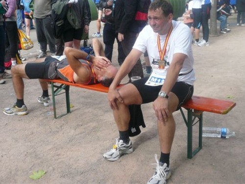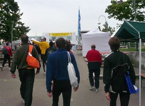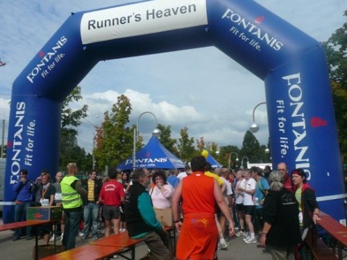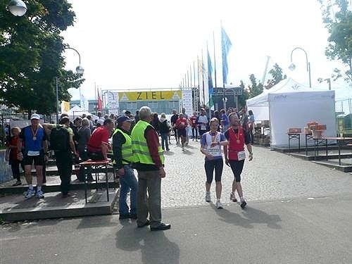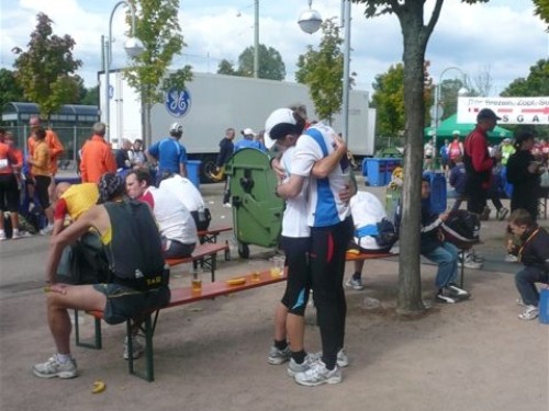 Das Gelände rund um die Europahalle nimmt mich herzlich auf, Musik spielt, Zuschauer freuen sich, der Ansager tut was er kann, um möglichst viele namentlich zu erwähnen, lachende, wohlwollende Gesichter auf Seiten der Zuschauer, freudestrahlende Finisher, die sich in den Armen liegen, kaputte Finisher, die am Boden liegen – geschafft!