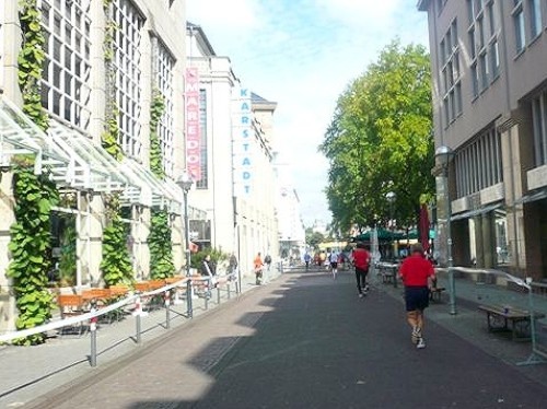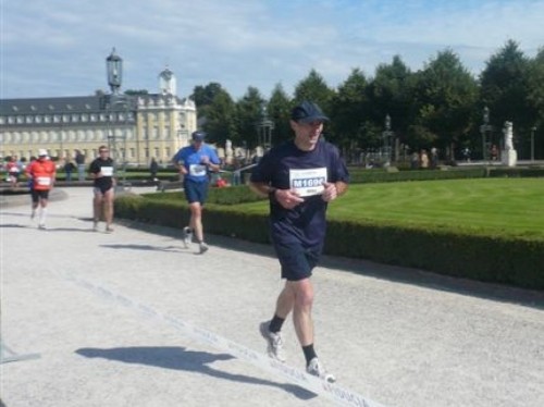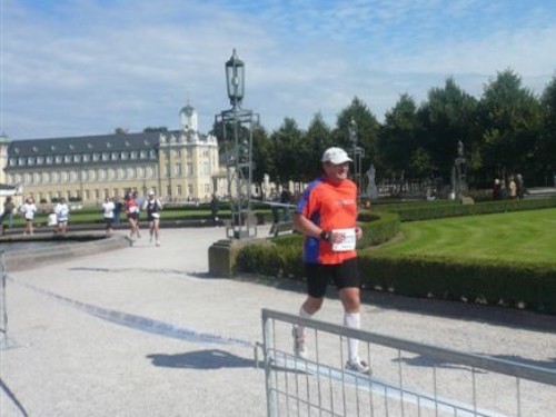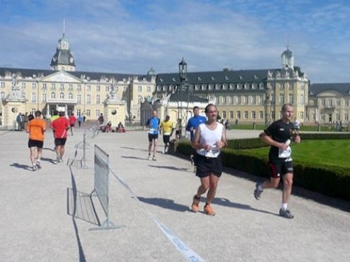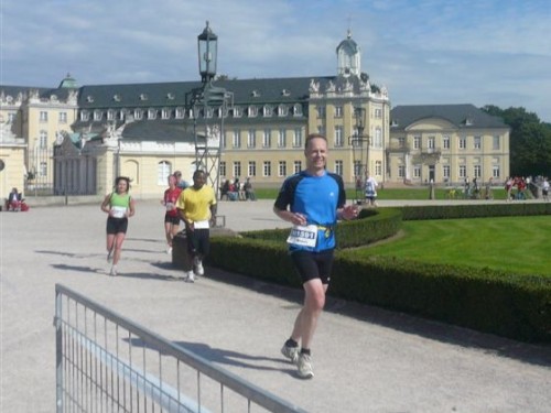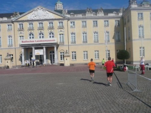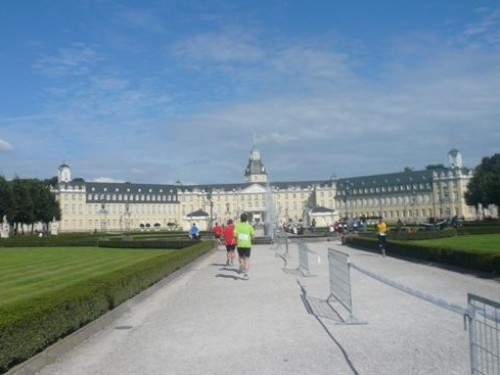 Herrlich bescheuert laufe ich also weiter. Meine Lieblingskilometer. Sorgenfreie Kilometer. Nichts und niemand kann mich ärgern. Hier in Karlsruhe schmückt das riesige Schloss meinen unbeschwerten Zustand. Die Läufer kreiseln durch den Schlosspark. Links am Schloss vorbei, dann rechts, dann wieder links, noch eine Schleife und noch eine Acht, dann wieder rechts... Karlsruhe muss ja zeigen, welch schöne Seiten es hat, also hält man sich hier halt ein wenig länger auf. Mich wundert´s, dass man nicht auch noch durch das Schloss hindurch läuft, aber ich befinde mich ja, wie erwähnt, im Zustand geistiger Umnachtung. Möglicherweise bin ich ja auch einmal zuviel herumgelaufen. Dem Drehwurm entkommen, ziehe ich quietschend durch die Fußgängerzone, am Kongresszentrum und dem Zoo vorbei und durch die Beiertheimer Allee wieder zum Ausgangsort zurück.