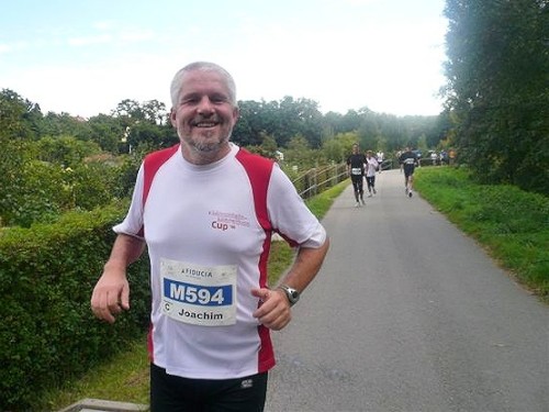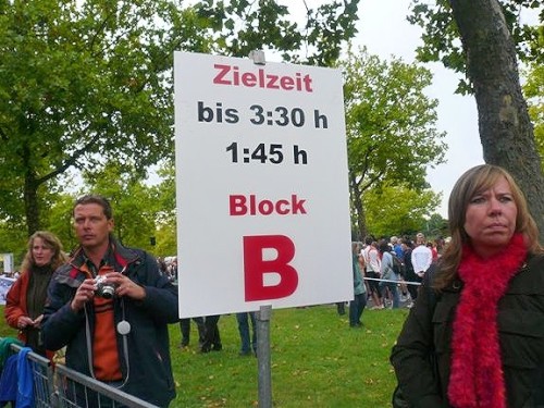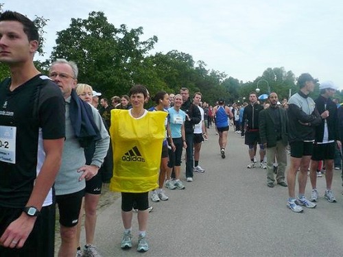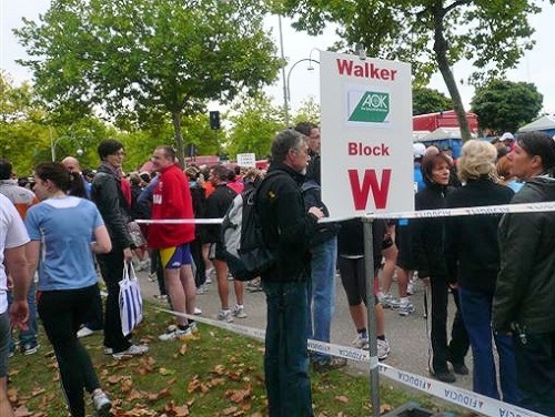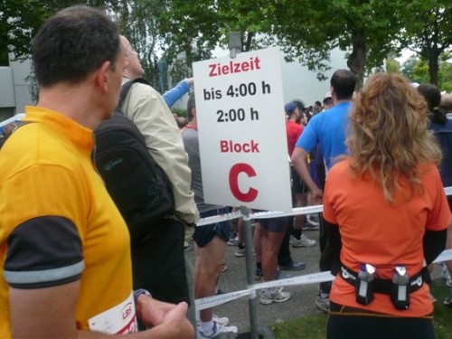 Gut ausgeschlafen mache ich mich auf den Weg zur Europahalle, gebe mein Gepäck in einer Schule direkt am Gelände ab und begebe mich in meinen Startblock. Gestartet wird von zwei Seiten entlang der Hermann-Veith-Straße. Links die Schnellen, halbwegs Schnellen und gemütlich Schnellen um 9:00 Uhr, rechts die gemütlichen Genießer, Power-Walker und diejenigen, die zum ersten Mal einen Marathon laufen um 9:10 Uhr.