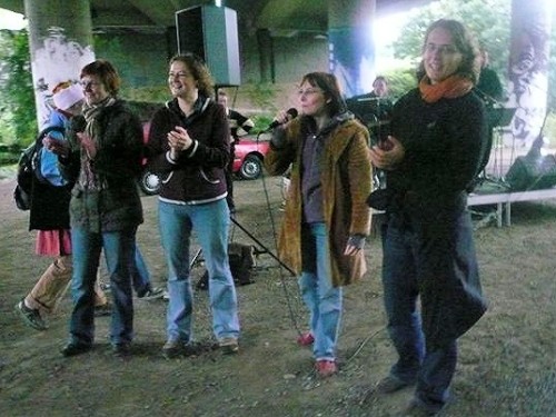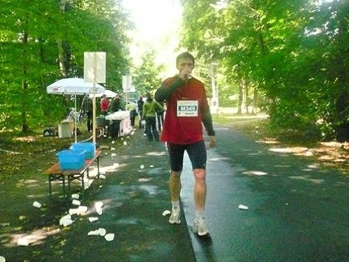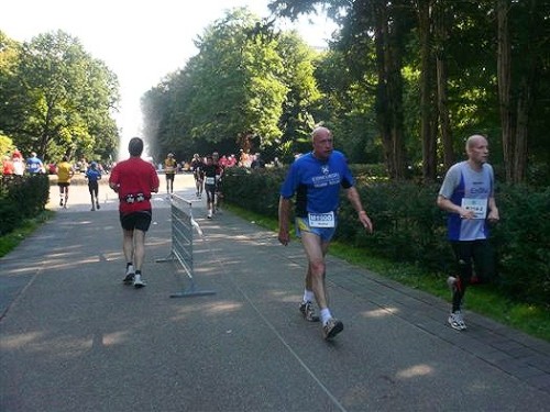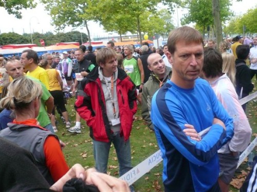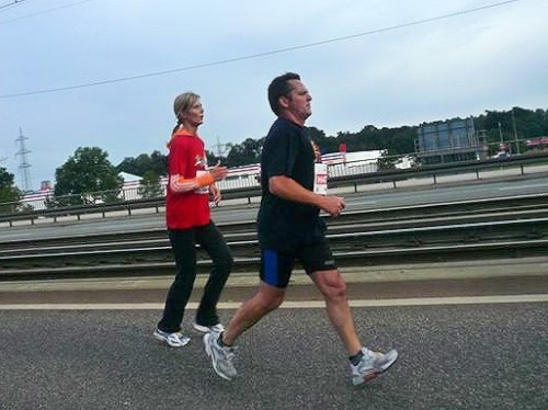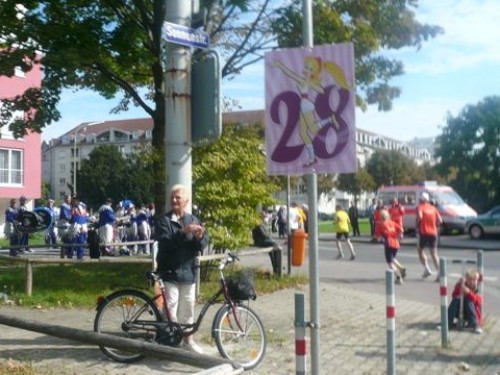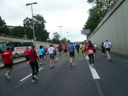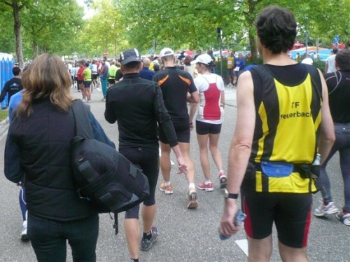 Jetzt muss ich wirklich nachdenken. Gab es hier bei der Halbmarathonweiche nicht eine Möglichkeit auszusteigen? Sich einfach so aus dem Staub zu machen? Mit Wertung? Also Quasi ohne Schmach? Fatale Versuchung für eine müde, alte Läuferin mit neuerdings Fußschmerzen. Und sagte ich nicht gestern beim Nudelessen zu meinem Tischnachbarn, dass es mir echt zu blöd wäre, unter Schmerzen zu laufen? Hm, ich muss mal ganz scharf überlegen… Mitten in meinen doch so verlockenden Gedanken sehe ich einen alten Bekannten am Wegesrand stehen. Stephan ist seinen ersten Halbmarathon gelaufen - in einer tollen Zeit von 1:41. Glückwunsch! Schade, ich würde gerne noch kurz plaudern, aber ich muss weiter. Marathonlaufen! Also weg mit den unnützen Fluchtgedanken. Der Fuß tut auch schon nicht mehr weh. Es ist wohl auch nicht der Fuß, sondern der Schuh, der herumzickt. quietscht und jammert!