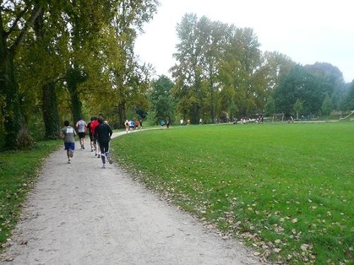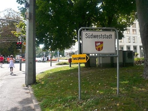 Pünktlich um 9:00 Uhr geht es also los. Die Masse bewegt sich auf großen Straßen in den Südosten von Karlsruhe. Auf der Durlacher Allee zieht das Läuferfeld über Brücken an Bahnschienen und der Autobahn vorbei. Nach acht Kilometern wird die Strecke etwas spannender, Zuschauer singen, klatschen und freuen sich. Hier in Durlach heißt man die Läufer willkommen. Eine schöne Überraschung: Renate, die ich vor einigen Wochen beim Monschau-Marathon bei eisigem Wind kennen gelernt habe, läuft mir über den Weg. Heute ist es alles andere als kalt. Ideales Laufwetter. Die Sonne zeigt sich immer wieder, es sind etwa 17 Grad und kein böser Wind hält auf. Hinaus geht’s durch den Oberwald in Richtung Rüppurr.