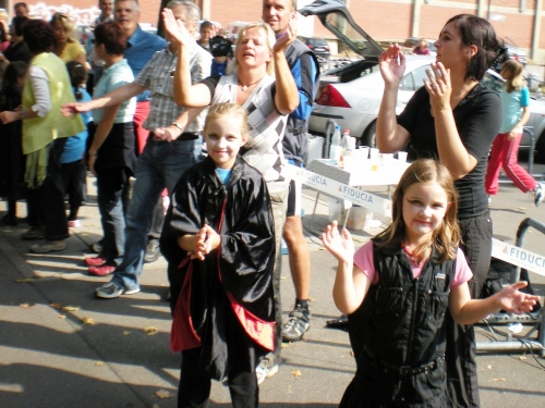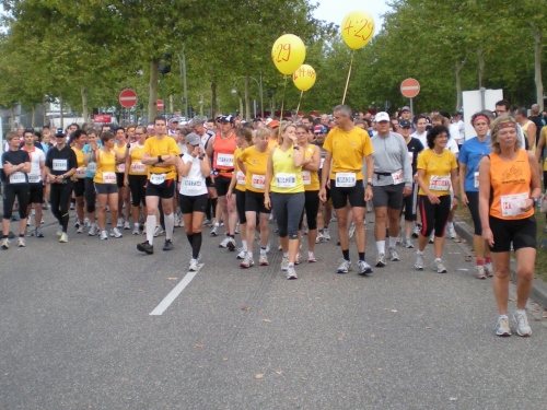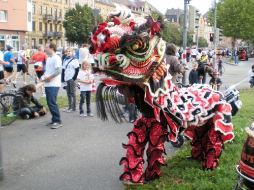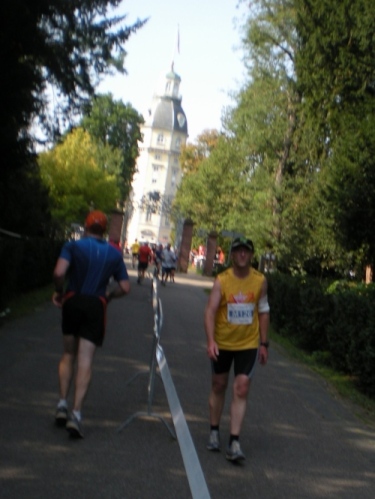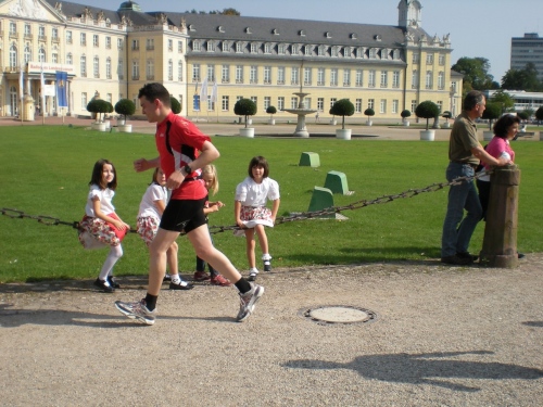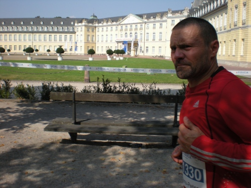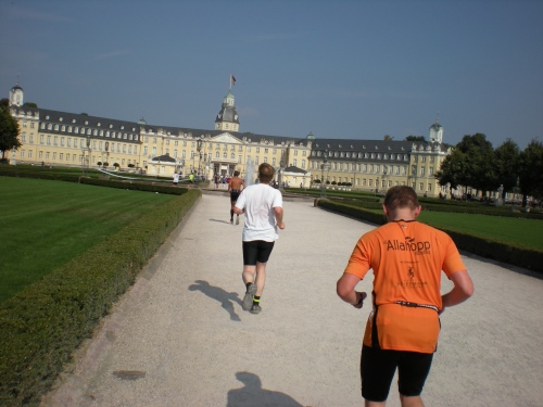 Dann die Knielinger Allee, eine wichtige Straße des Karlsruher Fächers und schließlich durch die Hans-Thoma-Straße (Künstler + Professor 1839-1924), direkt auf des Karlsruher Schloß zu. Es ist der bewegendste Moment des Marathon. Ich fühle mich wie König Ludwig XIV, wie der Sonnenkönig. Ich laufe strahlend auf das blendende Schloss zu. Davor wird natürlich getanzt. Einfach passend.