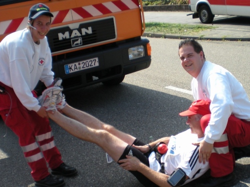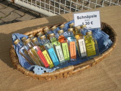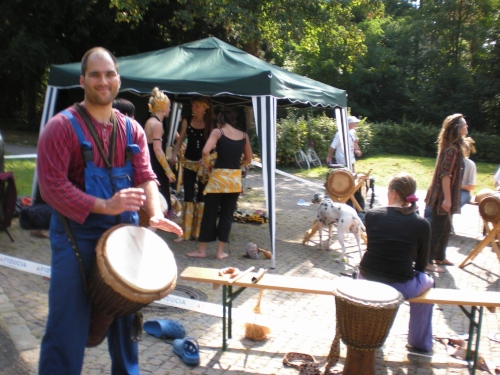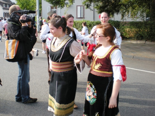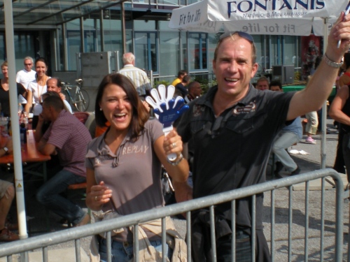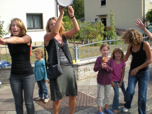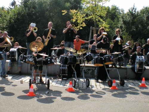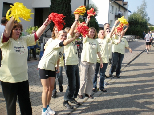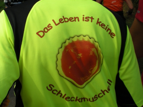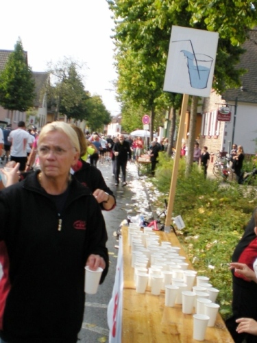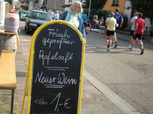 Die Wege sind schmal, es ist schön grün, aber von Ruhe keine Spur. Alle paar Meter sind Stimmungsnester, Sonnenschirme markieren die Stellen, wir werden förmlich durch den Wald gejagt nach Rüppur, wo uns schon wieder die nächste Band einheizt. Hier wird Wein verkauft für einen Euro, Schnaps für 1,30....Tische und Bänke auf den Straßen, lachende Leute beim Bier. Leute, ich habe noch 26 Kilometer vor mir! LaOla-Welle hier, LaOla-Welle da. Keine Ruhe, wir werden weiter getrieben von Tanz, Musik und Zuschauern.