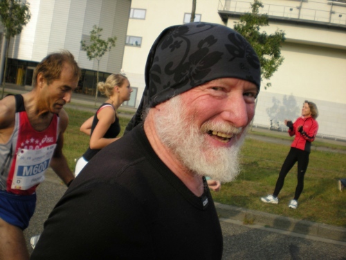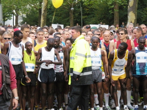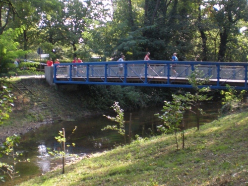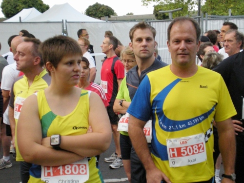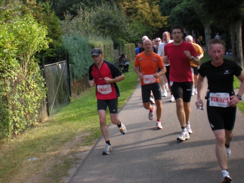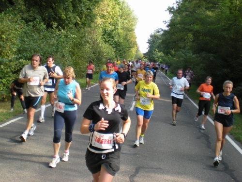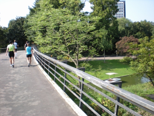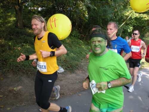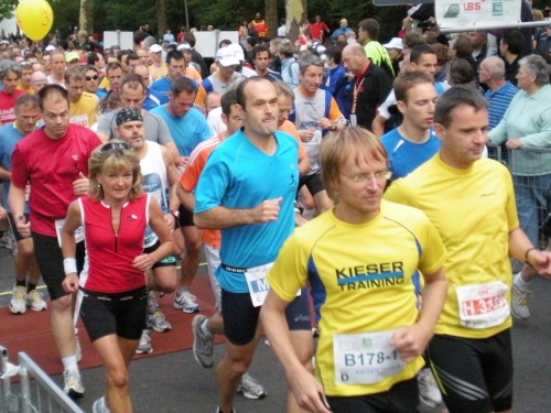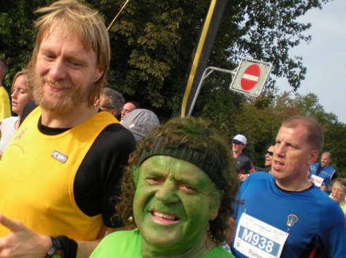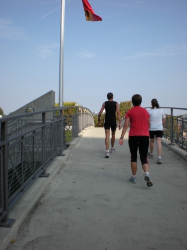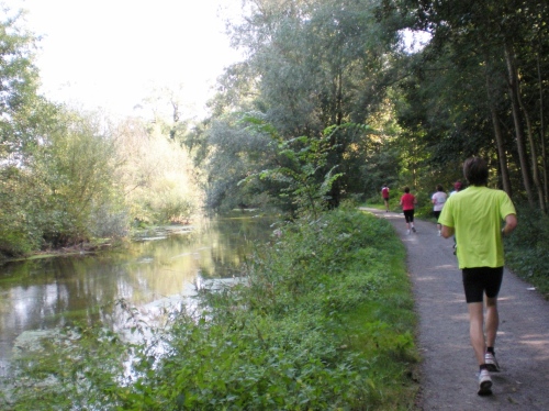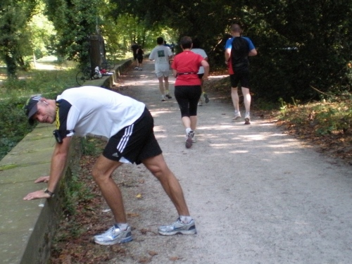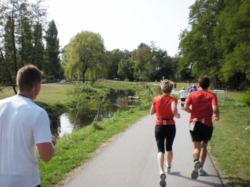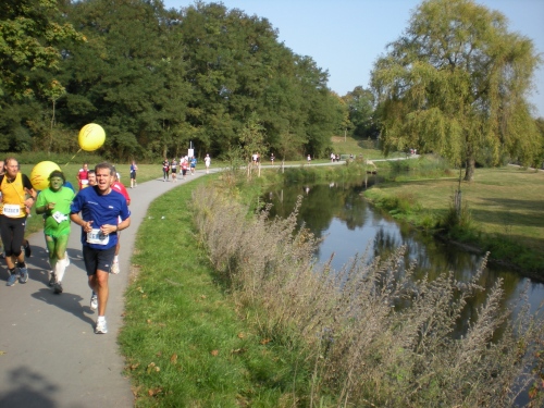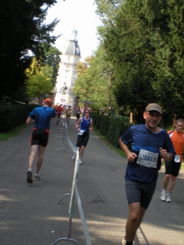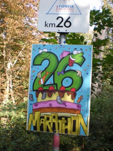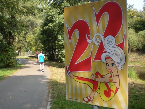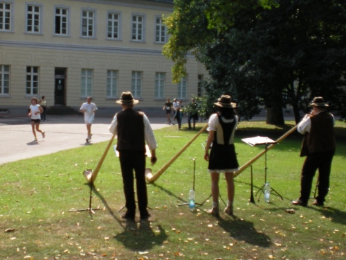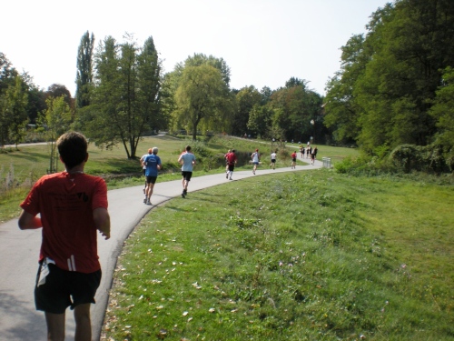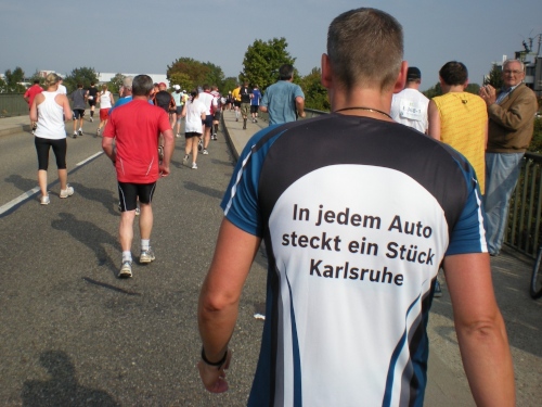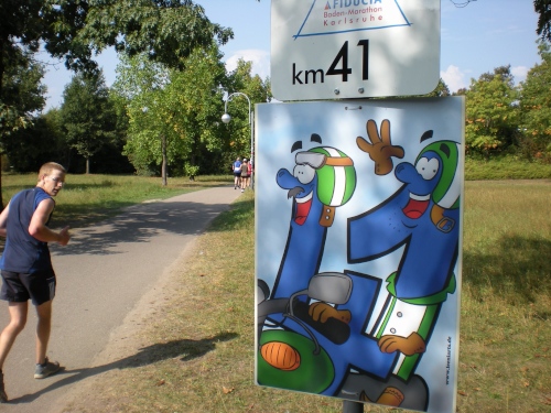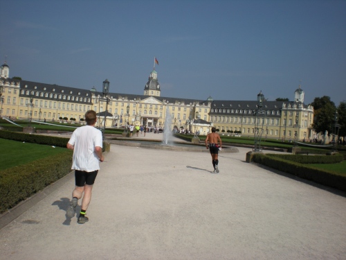 Ich bin bei km 20, als mich der Keniaexpress überholt. Es beginnt die zweite Hälfte des Marathons, auf die habe ich mich gefreut: Sie ist ein Schmankerl für den Sightseeing-Läufer. Zunächst geht es durch einen grüne Park, der Günther Klotz Anlage (ehem. Oberbürgermeister), wo schon Generationen von Studenten gejoggt sind. Die Grünanlage ist eine der größten innerstädtischen Parkanlagen Deutschlands. Durch ihn fließt der liebliche Fluß Alb, der im Schwarzwald (Bad Herrenalb) entspringt. Von den zahlreichen Studenten, die hier grillen, wird die Anlage romantisch-liebevoll „Klotze“ genannt.