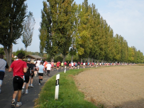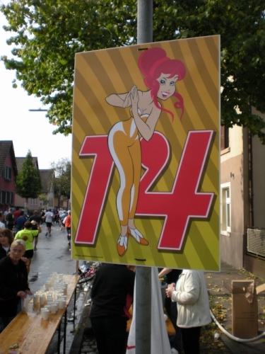 Am BGH und am Staatstheater vorbei geht es zur Oststadt. Singende Studenten auf den Straßen, Musik aus riesigen Anlagen, einige Zecher laufen uns mit Biergläsern hinterher. Ich muss grinsen, ich habe doch noch 37 Kilometer vor mir. Geradewegs führt uns die Durlacher Allee in den gleichnamigen Ort. Wie oft bin ich hier schon auf der A 5 vorbeigefahren.