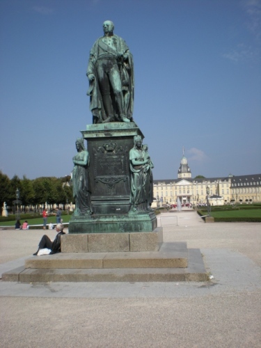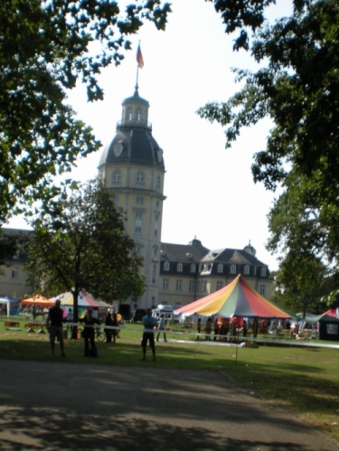 Friedrichsplatz, der Marktplatz mit der Pyramide, darunter befindet sich die Gruft der abgerissenen Konkordienkirche, in der der Gründer und Namensgeber der Stadt, Markgraf Karl Wilhelm von Baden.Durlach (1679-1738), bestattet ist. Und hier bekomme ich seit langem wieder diesen geilen Kälteschauer auf den Rücken: Vom Rathaus tönt das absolut beste Glockenspiel, das ich je gehört habe, vermischt sich mit der Musik der Salsatänzer und dem Jubel der Zuschauer, während ich hier durch die Laufgasse stürme... einfach klasse!