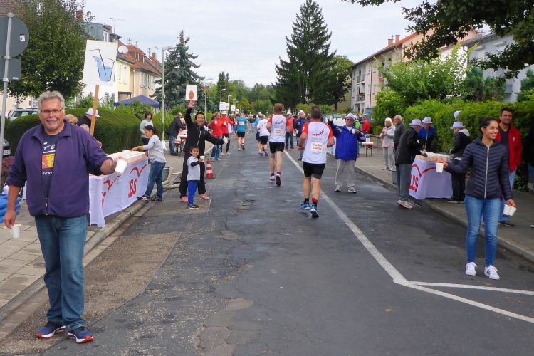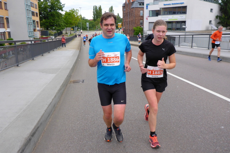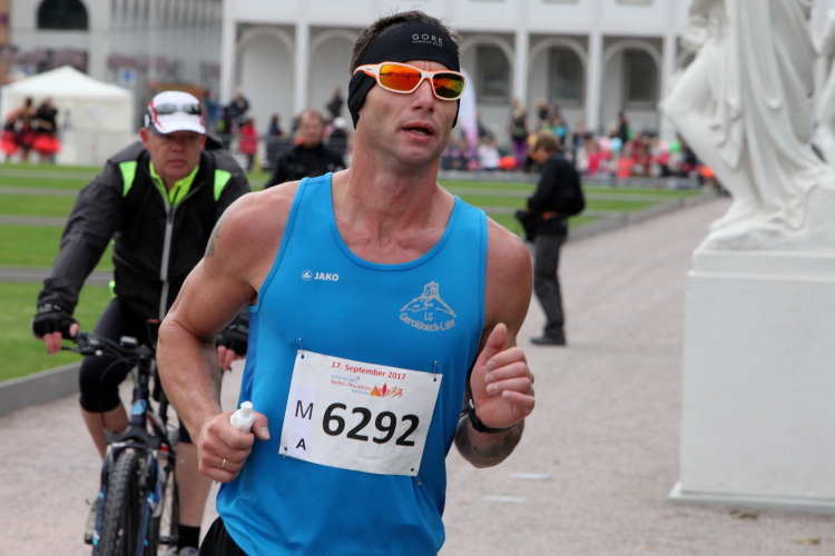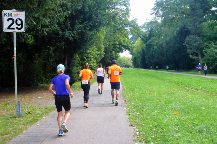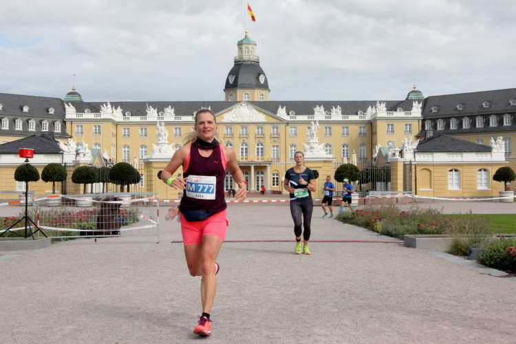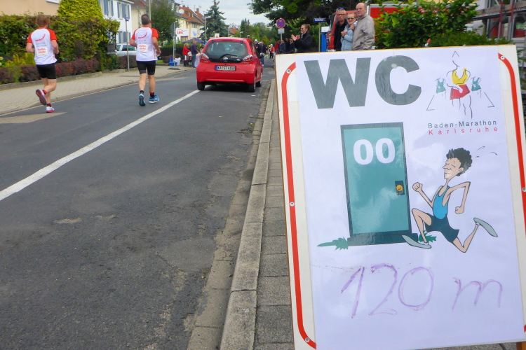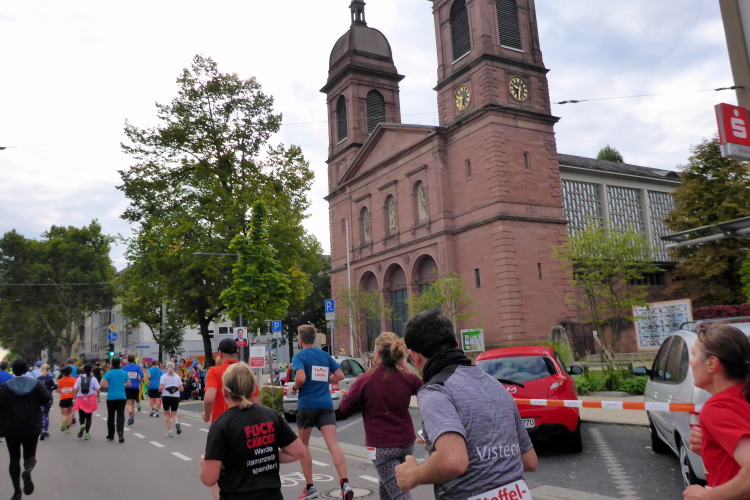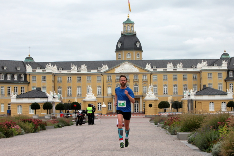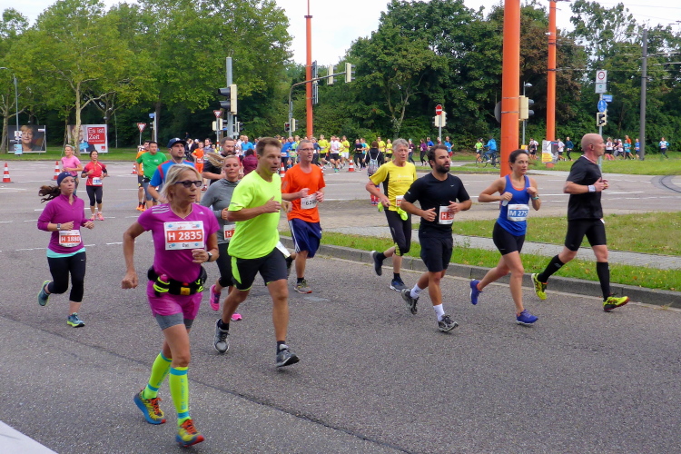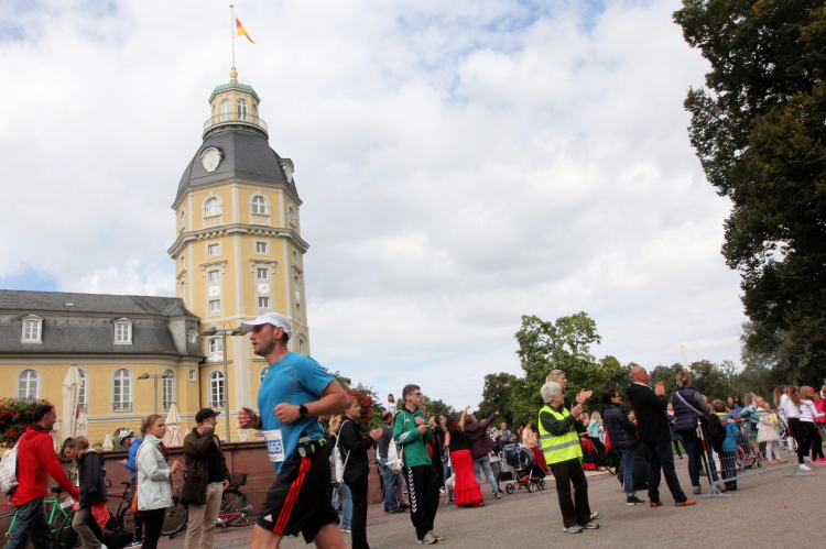 Schnell sind die ersten km auf der badischen Spargelstraße gestochen – pardon, will sagen: gelaufen. Eine sehr heitere Atmosphäre herrscht auch unter den Krautköpfen entlang der Strecke. Ja genau, nun statten wir den Weststädtern einen Besuch ab. Begeisterter Jubel auch hier zwischen Innenstadt und dem älteren Stadtteil Mühlburg, beidseits der Kaiserallee. Am ersten VP gönne ich mir lediglich einen Becher Selters, denn ich will weiter, mehr von Karlsruhe sehen und erleben. Gitarrenklänge hallen von Balkonen und Dance-Acts liefern heiße Gigs auf dem Trottoir. Es ist erstaunlich, wie schnell ich das erste Viertel der Königsdisziplin abgerockt habe. Ununterbrochene Dauerstimmung entlang der Strecke!