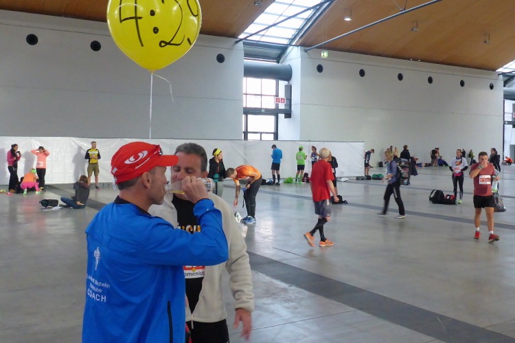 Gerade beschleicht mich ein ungutes Gefühl bei all dem Service hier: Gönnt sich Marathon-Mario hier etwa ein Wellness-Wochenende ohne Frauchen und Kids, anstelle einer Sportveranstaltung? Ich komme zum Ergebnis, dass für uns Läufer beides doch ein und dasselbe ist. Schlechtes Gewissen? Awa! Irgendwie muss ich aber wohl dann doch getrödelt haben, denn in nicht einmal mehr zehn Minuten ist Marathon-Start. Ich muss jedoch unbedingt noch mal in die Keramikabteilung! Nadierlig: wieder mal lange Schlangen vor jedem Topf. Man staune, auch bei den Herren herrscht äußerst unruhiges Gezappel. „Komm ma' mit“, flüstert mir einer zu. Ich folge ihm äußerst skeptisch zurück zum Eingangsbereich. Eine Wendeltreppe führt ins Untergeschoss, dort unten ist es recht dunkel. Aha, auch hier ein stilles Örtchen – im wahrsten Sinne. Jedoch nun kein Geheim-Tipp mehr für 2018, denn im Folgejahr zieht der Marathon zurück vor die Europahalle. I