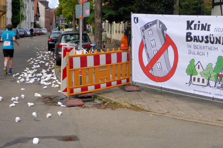 So, wo befinden wir uns gerade? Ah, km 12, Litzenhardtstraße. Gerade verläuft die Strecke am Friedhof Bulach vorbei. Hmm, wusstet ihr, dass in der Litzenhardtstraße zu bestimmten Zeiten gern mal einige Bulicher Hexen aufgeknüpft werden? Ah sieh an, hier steht ja auch ein buntes Hexenhaus. Wie passend. Und warum klatscht ein riesengroßer Hamster im Blaumann grinsend in die Hände? So, ich geb' hier jetzt mal besser Gummi, im hohen Bogen um Bulach herum. Aus der Luft betrachtet laufen wir tatsächlich symbolisch um das Wappen herum. Ob das Glück bringt? Schließlich geht es wieder zurück durch den Edeltrud-Tunnel (zicke zacke hoi hoi hoi!) und an der schönen Alb entlang.
