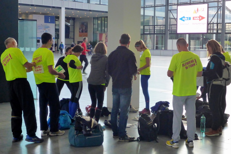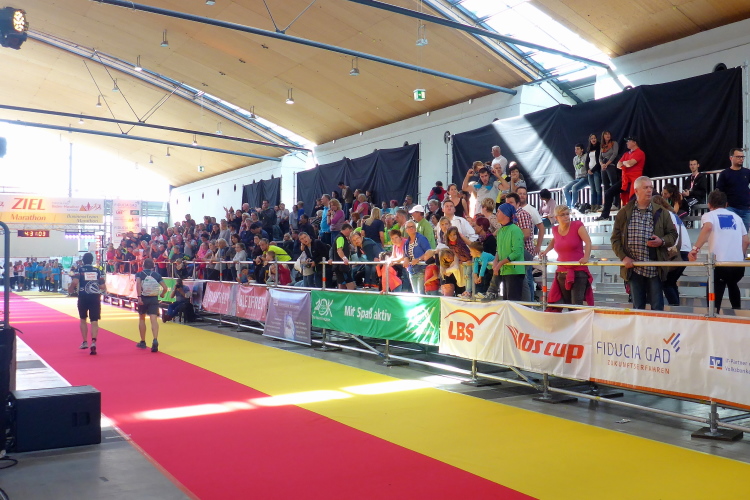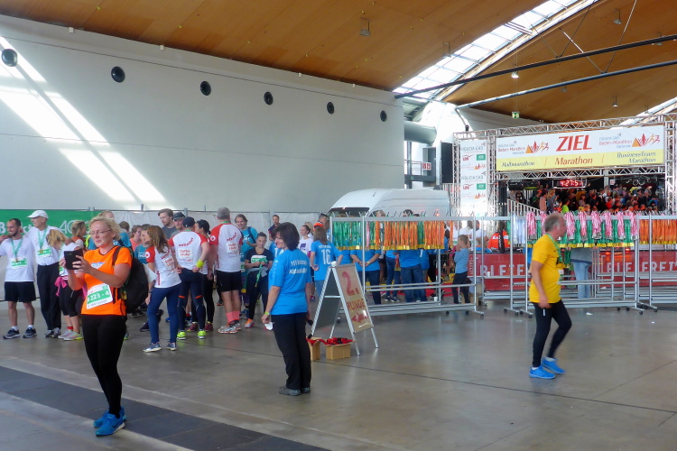 Die Messearchitektur hatte mich schon am Vortag zum Staunen gebracht. Und nun stehe ich erneut in dem gigantischen Eingangsbereich der Aktionshalle. Am Empfang wird bereits eine große Gruppe Staffel-Läufer eingenordet. Ich lasse kurz meinen Blick schweifen. Wirklich prächtig, der Bau. Eine rundum verglaste, lichtdurchflutete Konstruktion mitsamt LED-Wand, dahinter ein großzügig angelegtes, begrüntes Atrium. Da hast den vollen Durchblick. Ich schlendere schnurstracks zu Messehalle 3, auch hier ist ein Verlaufen gänzlich ausgeschlossen. Die Halle selbst ist derart überdimensioniert, dass auch hier jede Station sofort erkennbar ist: links die Startnummernabholung, am hintersten Ende der Halle die Gepäck – und Wertsachenaufbewahrung nebst Duschen und Massage, rechts die Maultaschenparty. Hergotts B'scheißerle satt! Von den Dingern kann ich einfach nicht genug bekommen. Aber Ich muss mich noch gedulden. Nachher gibt es ordentlich Nachschlag.