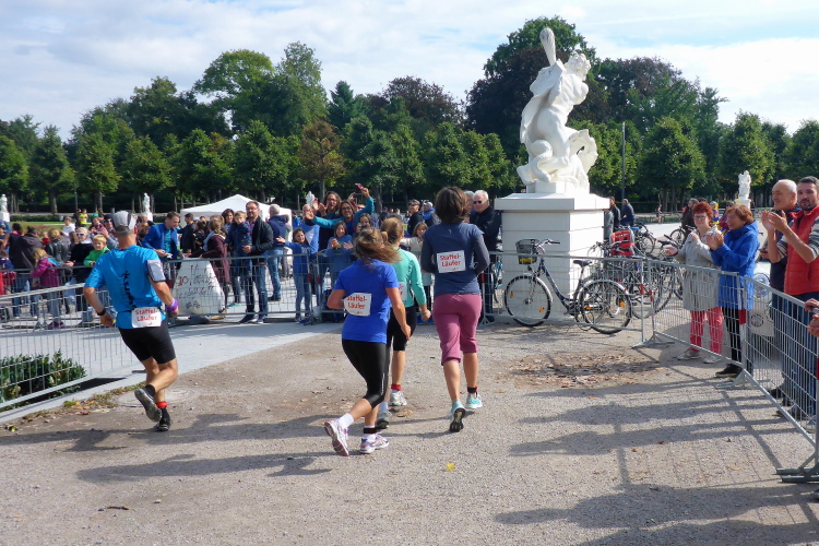 Schilder künden vorm ersten Team-Wechsel der Staffel-Läufer in hundert Metern. Wir passieren das Europabad Karlsruhe. In diesem gigantischen Erlebnisbad warten Schlangenbeschwörer und Astronauten in großen Rutschentürmen. Und während die Erwachsenen in der Sauna relaxen, werden die Kiddies in die Inselwelt abgesetzt. Ins Haifischbecken zu Kai – dem Hai. Die Betreiber versprechen jedenfalls Adrenalinkicks und bleibende Erinnerungen...ja, davon bin überzeugt. Im Hintergrund der der Günther-Klotz-Anlage (Spitzname: „Klotze“) kann man auch die Europahalle erkennen. Weiter geht es durch die Grünanlage, hier herrscht an der Wechselstelle ausgelassene Partystimmung. Hier wurden sechs Blöcke für die Staffel-Disziplinen eingerichtet, in die man sich links und rechts, je nach Startnummer, einordnet. Brav stehen die Staffelianer Spalier, klatschen bei den Einzelläufern ab, warten auf Ihre eigenen Kollegen, jubeln, schreien, ziehen freche Grimassen. Auf der Fest-Wiese wird Zumba getanzt und auf dem großen, grünen Rodelhügel im Hintergrund bietet sich einigen sicherlich ein tolles Panorama.