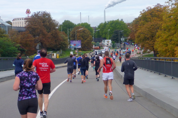 Wusstet ihr an der Stelle, dass sich die witzigen Karlsruher damals je nach Stadtteil eigene Spitznamen verpasst haben und die Bedeutung darüber dann teilweise in Vergessenheit geraten ist? Der regionale Neckname der Daxlander lautet jedenfalls Schlaucher. Tja, möglicherweise vom Enten einfangen mit schlauchförmigen Netzen, wer weiß das schon. Auf der Linken winkt uns gerade ein riesiger Michelin-Mann von der Fassade der gleichnamigen Reifenwerke zu. Ja, ich genieße den Lauf in vollen Zügen, umarme wie ein Olaf die Stimmung um mich herum und halte die Momente mit der Kamera fest.