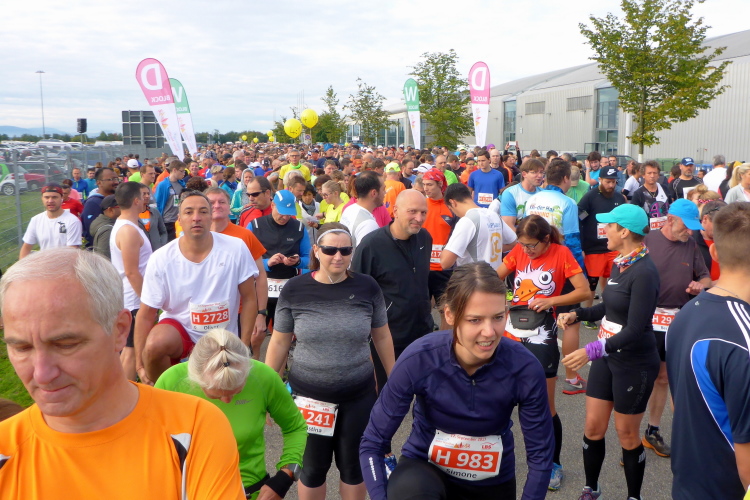 Achttausend gemeldete Starter wollen sich am Veranstaltungs-Wochenende auf acht Wettbewerben austoben, darunter Drittel-Marathon (15 KM), Power-Walking (21,0975 KM für Walker) und Inklusionslauf (Sportler mit Handycap, welche zusammen mit einem Partner als Zweier-Team einen Teil der Marathonstrecke absolvieren). Den Auftakt bilden gleich mehrere Disziplinen ab 9 Uhr: Marathon, Halbmarathon sowie Team-Marathon starten in den Blöcken A bis D. Die Power-Walker in Block W. Kaum trete ich ins Freie, muss Ich mich entlang des Zauns durch den Seitengraben nach vorn drängeln. Meiner einer, mal wieder auf den letzten Drücker! Urplötzlich brandet großer Jubel durch das Läufermeer, die Stampede wird auf Karlsruhe losgelassen. Nun muss Ich doch glatt meinem Starterblock C hinterher rennen, der sich bereits auf der Bundesstraße Richtung Weststadt bewegt.