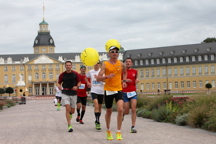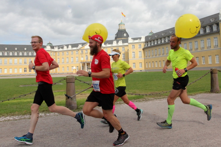 Zwei Zugläufer - Waldemar und Oliver vom Karlsruher Lauftreff memler.de – ziehen mit ihren „03:59“ - Ballons ebenfalls an mir vorbei. Ich bin wieder langsam unterwegs, ich merk' schon. Ich mache ausnahmsweise Platz, lasse sie vorbei. „Das letzte Wort ist in dieser Angelegenheit aber noch nicht gesprochen“, rufe ich noch hinterher. Das Ende vom Lied: die beiden hab ich nie mehr wieder geseh'n.