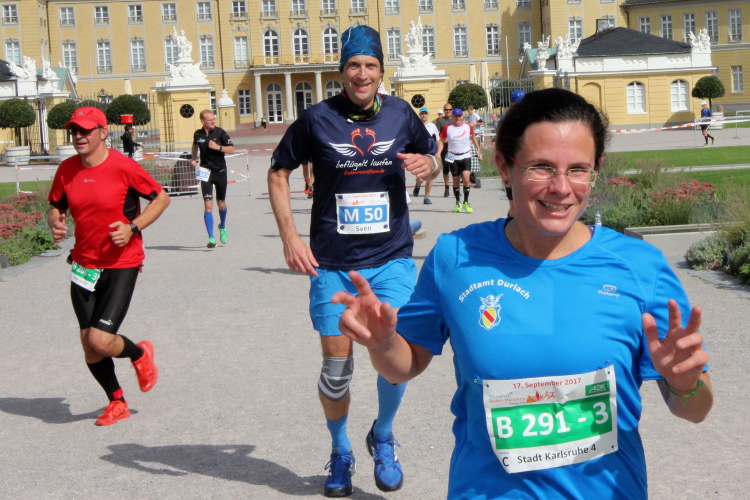 Der Europaplatz ist einer der belebtesten Plätze in der Innenstadt, großer Straßenbahnknotenpunkt des Karlsruher Verkehrsverbundes (KVV) und nur wenige Minuten Fußweg entfernt von meinem Hotel. Läufer aller Altersklassen strömen aus allen Richtungen hierhin, begrüßen und umarmen sich freudig. Untereinander werden so manche Schwaben-Weisheiten oder Witze ausgetauscht; es wird gescherzt und gelacht.