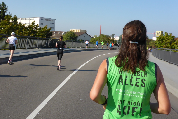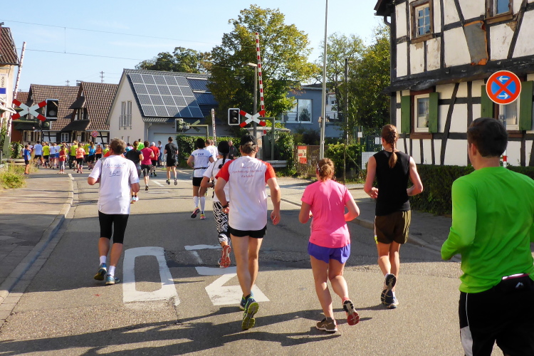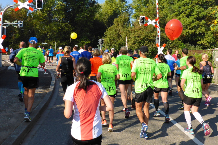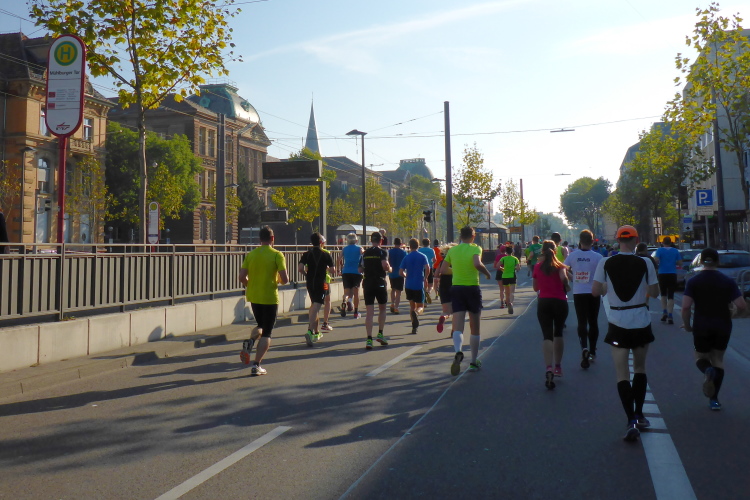 Wir starten und  beginnen unseren Lauf auf der B 36 in Richtung Daxlanden. Das ehemalige Fischerdorf stellt nicht die Börsenentwicklung nach. „Dax“ ist ein altes Wort für Deich. Das Läufermeer rennt deichlos. Auf der dreispurigen Straße kann jeder seine Geschwindigkeit ausleben, kein Problem. Es sind hauptsächlich HM-Läufer, Team- und Staffelläufer, die werden bei dieser hohen Anfangsgeschwindigkeit wohl nicht verrecken. Team- und Staffelläufer sind eigentlich dasselbe, Crazy Cats laufen „Schnurrend durchs Ziel“, die Carpe rennt „ heute leider ohne Antipasti“ und die anderen „strotzen vor Energie“, „Die Zeit ist reif“, „Verantwortung für die Bauplanung“ und „Wir Dehnen und Beugen um hohe Spannungen zu erzeugen“.  Beim Studieren der T-shirt-Aufschriften schmelzen die ersten Kilometer.