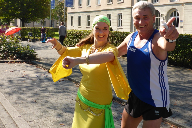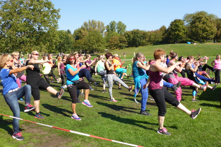 Im Gelände vor der Europaanlage, in der Günther-Klotz- Anlage (Klotze), wärmt die Gruppe fit-in Zumba 5.0 die Staffelläufer auf.  Theoretisch, denn als ich zwei Stunden später wieder hier vorbeilaufe, wird immer noch reichlich gewackelt, da müssten doch alle schon heißgelaufen sein. Also richtiger Sport und nicht so, wie bei den Golfern im Startgelände.