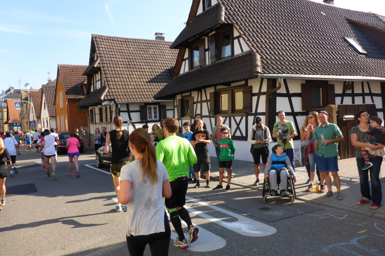 Bei km 6 geht es auf die Brauerstraße, die wir sonst die Jahre hinaufgelaufen sind. Nein, es gibt immer noch kein Bier. Aber in Beiertheim finden die ersten Vorgartenparties statt. Die Karlsruher Laufstrecke hat sich sehr verändert, das nutzen die neuen Streckenanwohner reichlich, um uns bei diesem schönen Wetter nach vorne zu pushen. Beiertheim ist wohlhabend, bürgerlich mit Gesellschaftshaus, Tanzhaus und Badeanstalt  aus dem 19. Jahrhundert.  Nach einer Kurve über Weiherfeld, vorbei am Gut Scheibenhardt kommen wir wieder zurück auf die Grenze zwichen Beiertheim und  Bulach (km 14).
