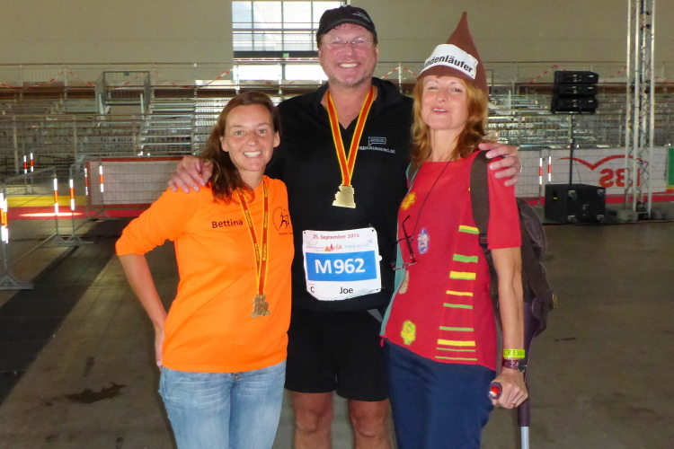 „Klasse Joe! Du schaffst das!“ Ist ja gut gemeint, das Läuferfeld ist halt in meinem Umfeld dünn geworden. Ich überhole Wilfried Huber, er hat an allen Baden-Marathons teilgenommen. Also ist dies sein 34ter hier in der Stadt, sein 60er insgesamt. Er ist jetzt 76 Jahre alt und beendet seine Marathonlauferei heute. Er will sich auf kürzere Strecken konzentrieren. Unsere Weltrekorthalterin hat sich letzte Woche den Arm gebrochen, René Wallisch finisht seinen 1557ten.