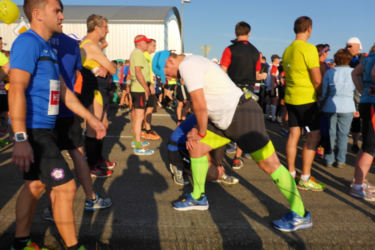 Die Anfahrt der enorm vielen Läuferautos über die B36 ist herrvorragend geregelt, die Parkplatzanweisungen laufen super. 8000 Läufer, davon ca 1200 Marathonläufer (839 erreichen das Ziel)  sind angemeldet. In der Messehalle 3 ist die Gepäck- und gesonderte Wertsachenaufbewahrung. Sehr gut gemacht, sehr benutzerfreundlich, man könnte den zeitgleich stattfindenden Berlin Marathon toppen.