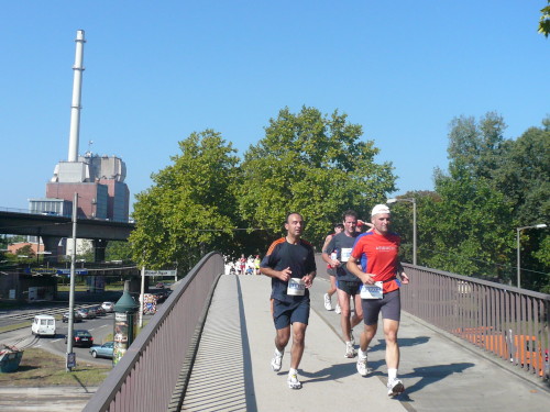 Einen Kilometer weiter geht es über die Autobahn und dann in den Oberwald (km 10), der Joggern und Walkern ideale Trainingsmöglichkeiten bietet. Auch heute sind viele unterwegs und beäugen die Marathonis bewundernd und manchmal auch etwas kritisch. Oder ist es Neid? Dem Wald folgen Kleingärten und bei den nächsten Häusern (Rüppurr, km 12,5) haben sich schon wieder viele Schaulustige versammelt. Lautstark feuern sie die Läufer an, denn es geht über eine steile Brücke. Früher war der Karlsruher Marathon ja als „Brücken-Marathon“ berüchtigt. Auch heute noch summieren sich die Steigungsmeter infolge Unter- und Überführungen zu einem netten Sümmchen. Allerdings kann man die Strecke nicht als „schwer“ bezeichnen. Dagegen sprechen eindeutig auch die Zeiten, die heute gelaufen werden: 2:14 für den Sieger (Ben Kimwole, Kenia) und neuer Streckenrekord bei den Frauen (2:39 - Irene Cherop, Kenia).
