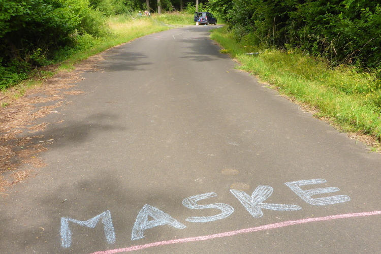 100 Meter Asphalt, wir überqueren die Autobahn. Dahinter auf dem Asphalt jede Menge Anweisungen und Abstandsmarkierungen, hier ist der zweite VP. „Moment, Moment“ ruft mir Andrea entgegen, „ erst Maske aufsetzen!“ – „Ähm ja, eigentlich wollte ich ja …“- „Hände her, es wird desinfiziert!“ Alles ein bisschen kompliziert und ungewohnt, aber lustig, neuartig und scheißegal.