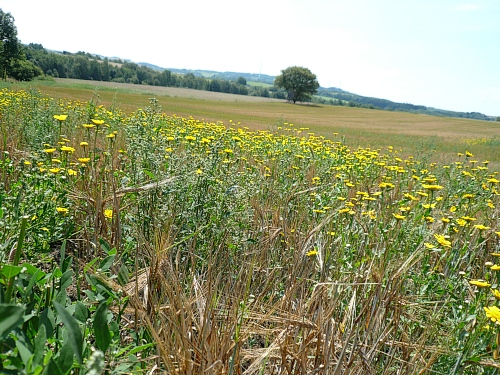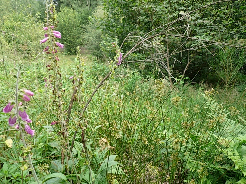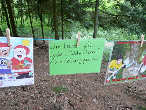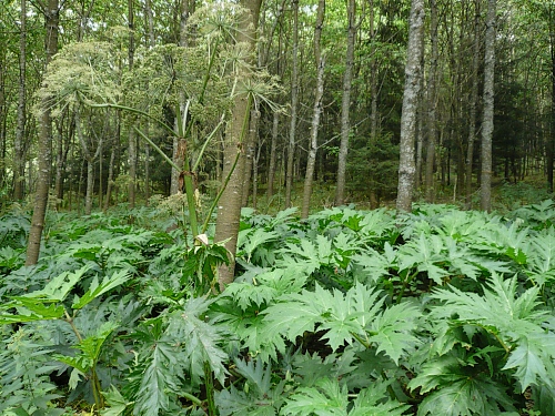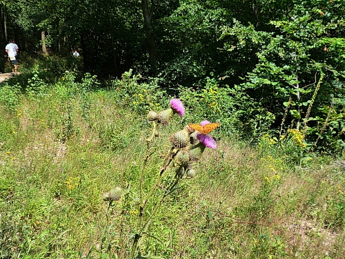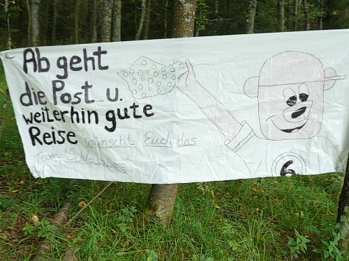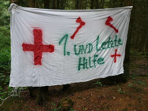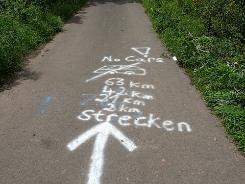 Herzliche Durchhalteparolen auf großen Bannern und Wäscheleinen. Das hat was! Rechts die großen Stauden des Riesenbärenklaus. Vorsicht! Nicht berühren, denn die Blätter hinterlassen starke Verbrennungen in Verbindung mit Sonneneinstrahlung (phototoxisch). Und Sonne haben wir jetzt reichlich. Und Bremsen - die bremsen nicht, die peitschen mich die Steigung hoch, und davon haben wir auch reichlich. Ich stelle fest, dass Pferdebremsen Zeckenrepellent mögen, und nehme meine klatschnasse Mütze, um mir die Blutsauger vom Leib zu halten.