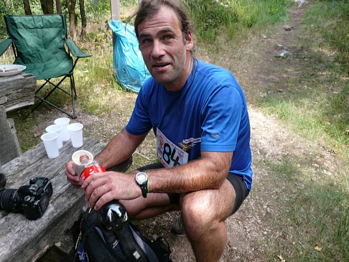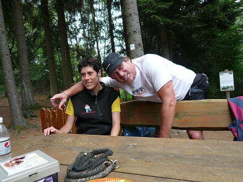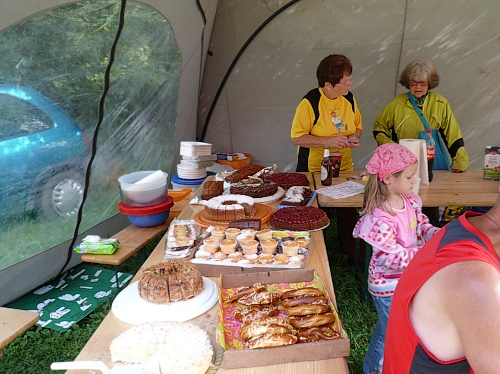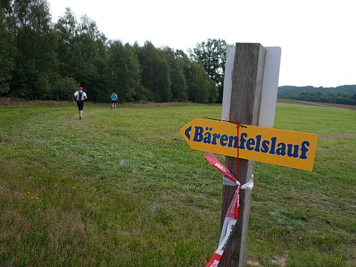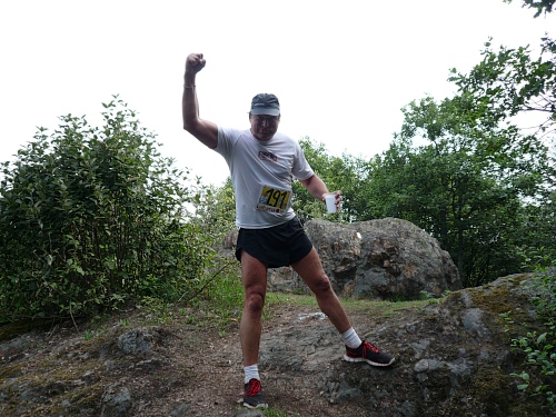 Ach, Quatsch. Mir tut wirklich alles weh, aber alles Quatsch, ich kann mich ja auf der zweiten Runde ausruhen. Zwei Becher Cola, ein Käsebrezel und ich mache mich auf den Weg. Diese Runde wird einsam, die Halbmarathonläufer kämpfen nun mit den Kuchen, die wirklich köstlich aussehen und ich kämpfe auch. Aber mir doch egal, sollen die doch kämpfen mit wem sie wollen. Ich kämpf mich wieder hoch auf den Bärenfelsen (km 6 der Runde). Mann, bin ich fertig! 900 Höhenmeter pro Runde wollen erarbeitet werden. Pause. Ich kann nicht mehr.