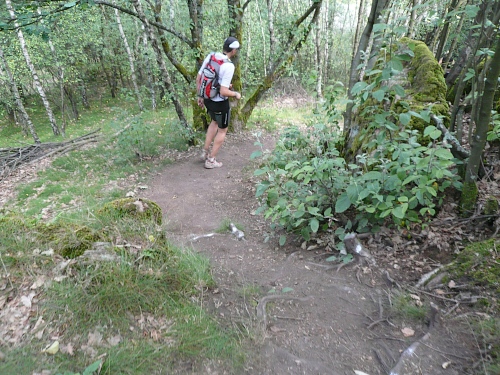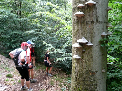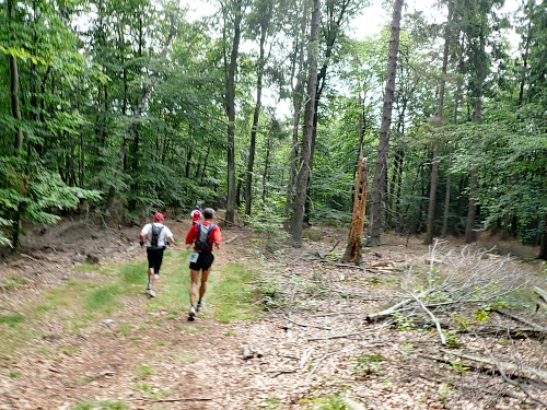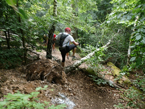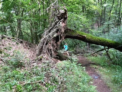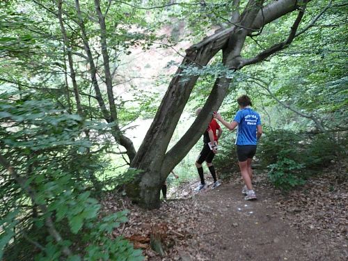 Jetzt kommt die Lieblingsstelle der Fellers: Über vermoderte Baumstämme, durch Horden von Mörderameisen, kein Weg erkennbar, die Äste der Hainbuchen klatschen dir ins Gesicht. Einfach klasse, ist auch meine Lieblingsstelle, sie wird auch gerne beim 50er Bärenfelslauf am 01. Mai genommen.