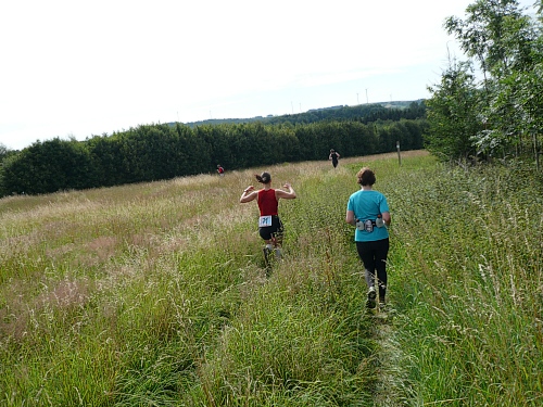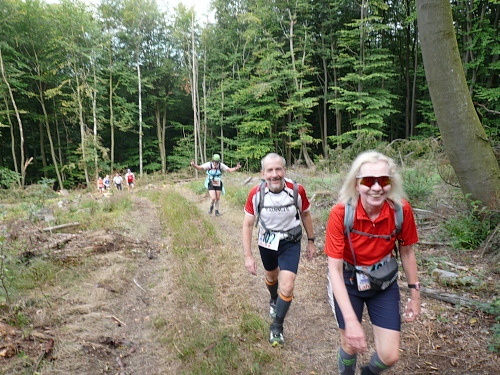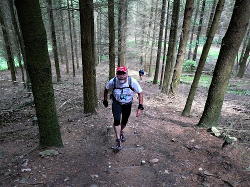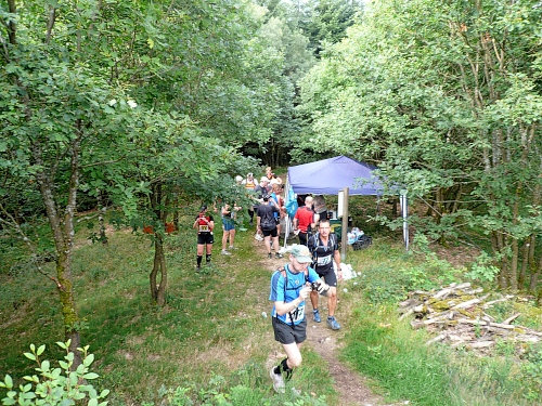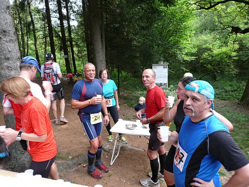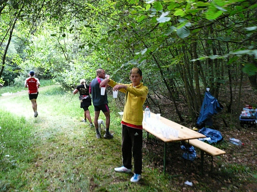 Km 18 - die Verpflegungsstation, die von den Enkeln betrieben wird. Du denkst, es sind nur noch 3 km bis zum Ende der Runde, aber es tut alles weh, und jetzt geht es erst richtig los. Traillaufen der feinsten Art. Der Sabber hängt dir in den Mundwinkeln und du kannst einfach nicht mehr, die Zehennägel sind eingedellt, die Hände blutig, das Gesicht zerkratzt und dann hat da so ein Riesendrache mit seinen Krallen die Erde metertief zerfurcht und du musst durch diese Randale durch: Hoch, runter, hoch runter, Treppen und Fallgruben, ich fass es nicht.