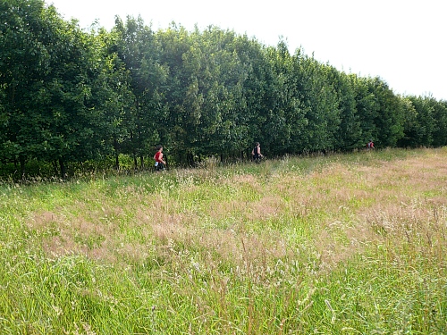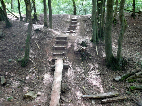 Bei der alten Eiche dann dringend benötigter Aufklärungsunterricht von Andrea. Haltet Euch fest: Der Start/Zielbereich wird Kampf-Fesplatz genannt. Grund ist, dass dort eine Raubritterburg stand und die Jungs sich auf dem Platz duelliert hatten. Ganz klasse die Recherche! Danke Andrea! Die letzten Kilometer werden mir jetzt leicht gemacht, denn nicht ein Riesendrache hat mit seinen Krallen dort randaliert, es sind die alten Burgmauern, die wir hoch und runter müssen. Ich mache Fotos von dem mächtigen Schuttberg, erkenne alte Schanzen, die die Eroberer angelegt haben, sehe den Start/Zielbereich, muss aber noch durch die alten Befestigungen. Die Treppen runter, hoch, runter, hoch. Ich weiß jetzt, dass dies ein historischer Ort ist.