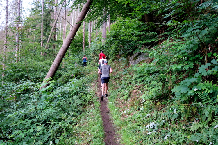 Rechts fließt die Wied. Ich konzentriere mich auf den schmalen Pfad. Es lässt sich hervorragend laufen. Eine Läuferin in Sandalen fällt mir auf. Respekt. An allen Abbiegungen stehen Helfer und feuern die Läufer mit Kuhglocken an. Rasch liegt der erste Km hinter uns. Jeder Km ist im Übrigen ausgeschildert. Es macht von Beginn an Spaß hier zu laufen. Das Wetter spielt auch mit. Es ist bedeckt, trocken und nicht windig. Optimale Laufbedingungen. Ich hab heute aber keine Ambitionen auf eine Kuhglocke als einer der ersten Drei in der Altersklasse. Ich bin noch zu kaputt vom K 43 in Davos und konzentriere mich aufs Fotografieren.