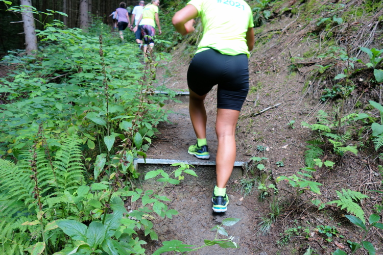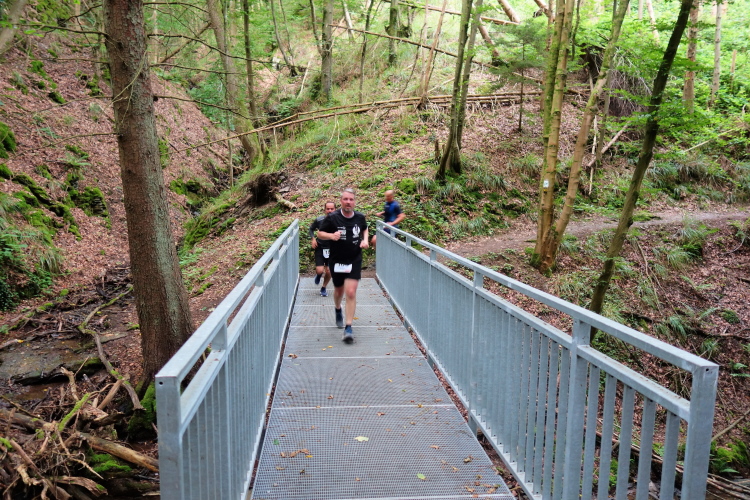 Auf schmalen Pfad laufen wir durch den Wald und kommen ins Tal des Hochscheider Bachs. Dieser wird auf einer festen Brücke überquert und wir steigen rechts lange hinauf. Ich gehe, die meisten anderen auch. Km 5 ist erreicht. Nimmt denn die Steigung gar kein Ende? Lange geht es hinauf. Trotz der Plackerei ist es wunderschön.