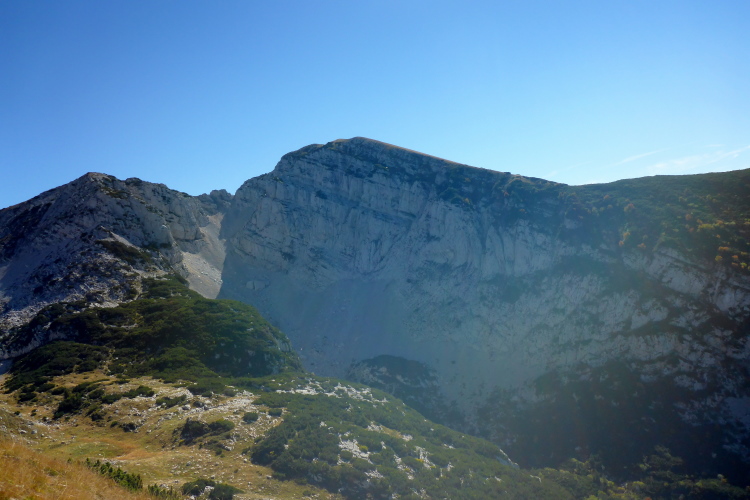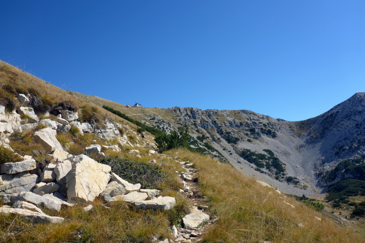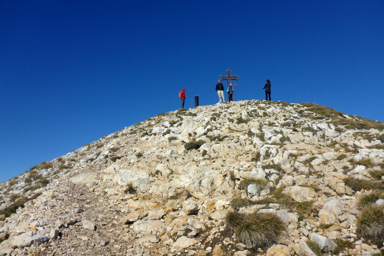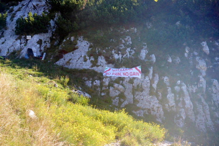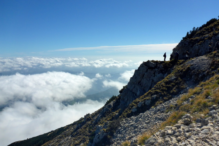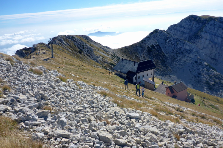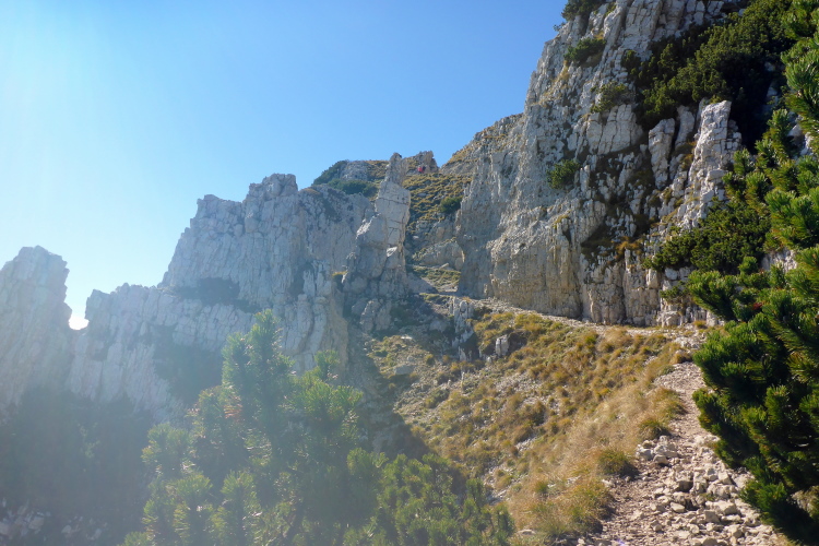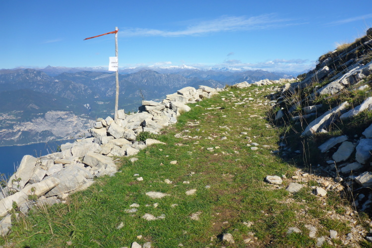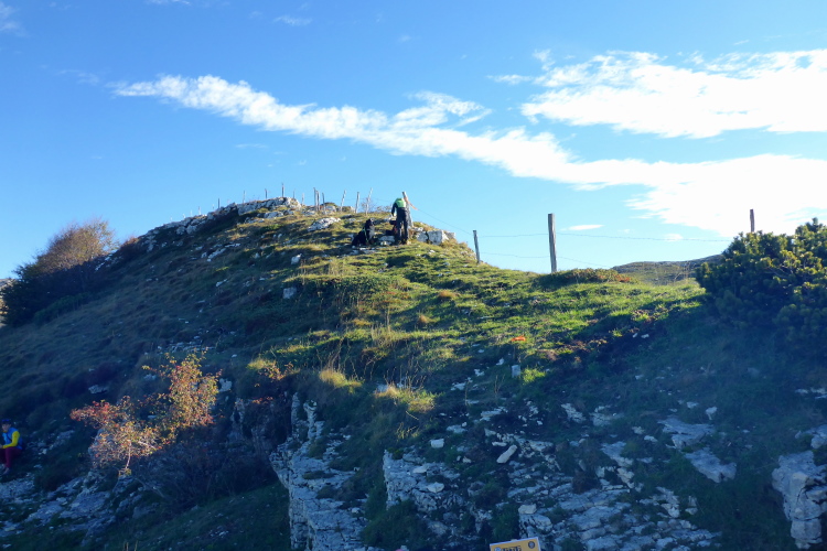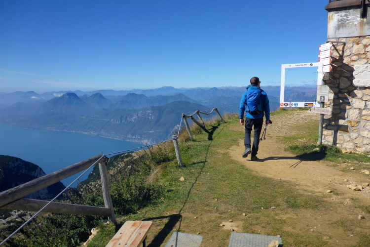 Oft ausgesetzt und mit einigen Kletterpassagen winden wir uns die nächsten 300 Höhenmeter den Berg hoch. Oft geht es nur auf allen Vieren. Immerhin helfen Ketten oder Seile an den schwierigsten Stellen. Schwindelfreiheit ist hier absolute Bedingung. Nach der Steilwand geht es ein Stück um die Bergflanke herum und vor mir liegt die Hütte und das mächtige Massiv des Monte Baldo. Ich gönne mir ein Bier an der Verpflegung am Refugio, bevor ich die letzten Höhenmeter zum Gipfel in Angriff nehme.