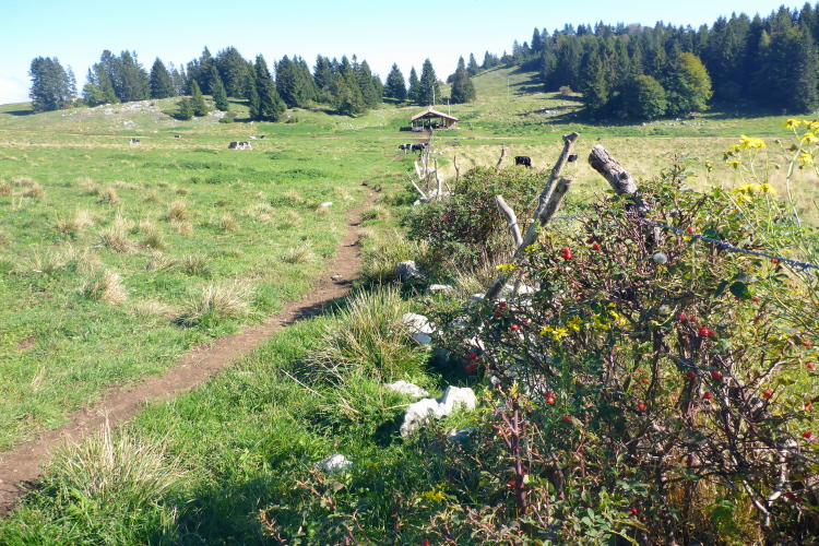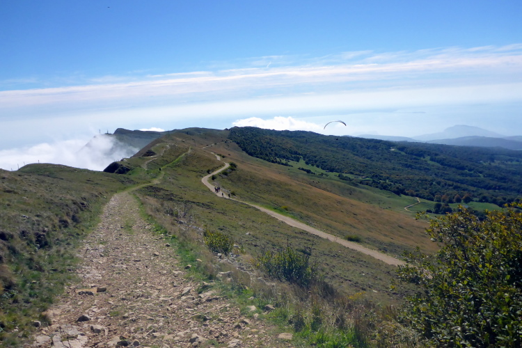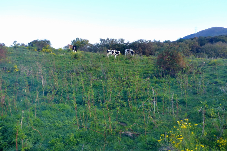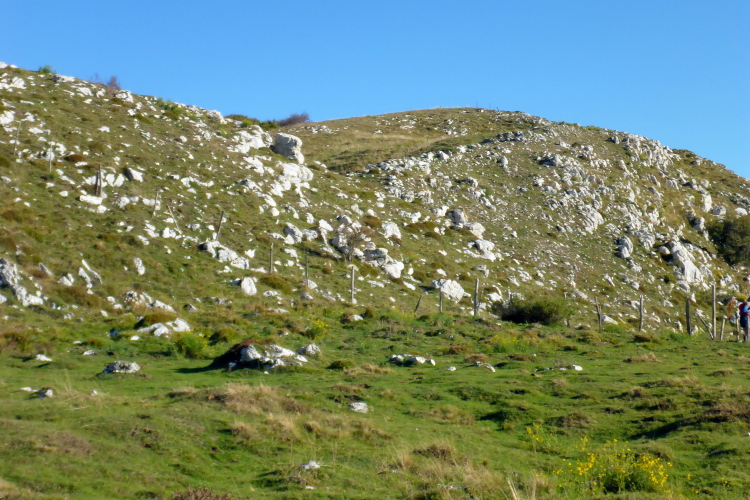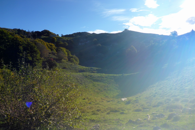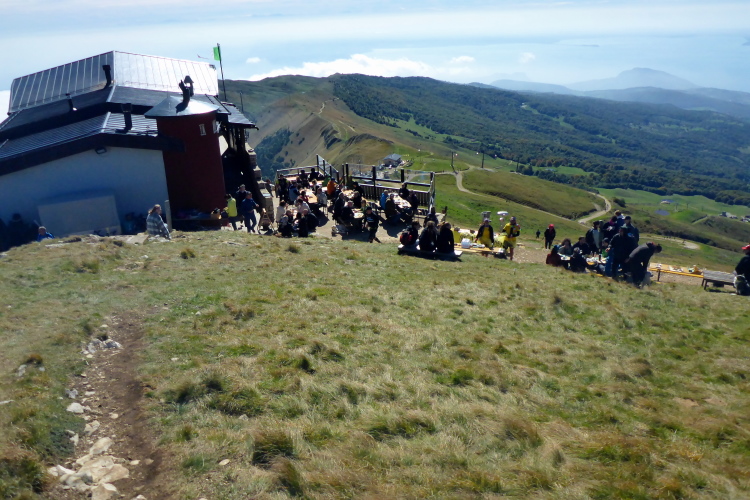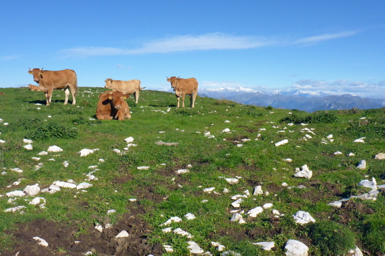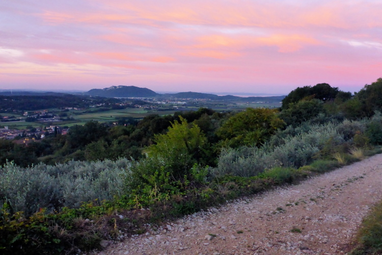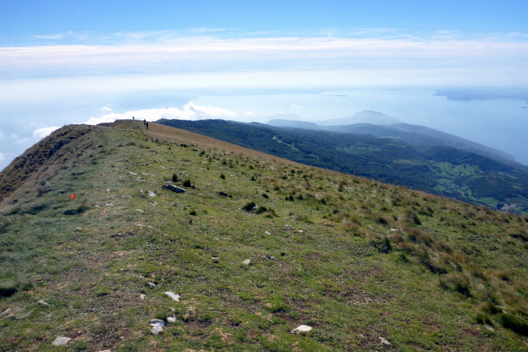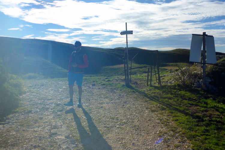 Wir laufen jetzt eine Runde um das Baldo Massiv. Steinig und von wegen nur noch bergab. Erst geht es mal wieder berghoch auf einen Aussichtsgipfel, den ich mir mit vielen Wanderern teile, die mit der Seilbahn angereist sind. An deren Bergstation befindet sich die nächste Verpflegung. Zu viel Betrieb. Schnell ziehe ich weiter. Vor und hinter mit sind jetzt nur noch Wanderer. Ich laufe bergab, entlang eines Grates, bevor es wieder richtig steil runtergeht. Aber schon bald ist es nicht mehr so steinig und ich trabe über Weiden und Wiesen ins liebliche Tal.
