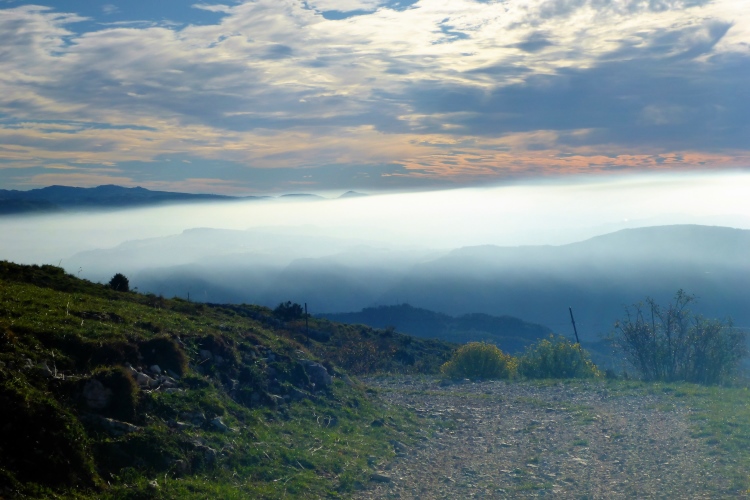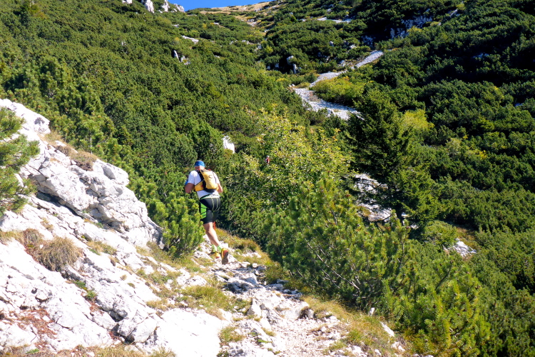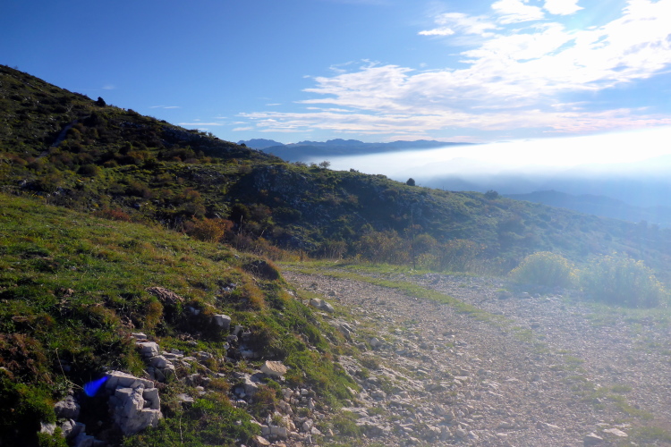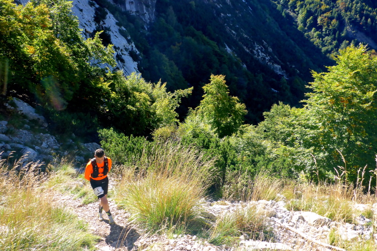 An der ersten Verpflegung nehme ich einen Becher Tee und bestaune den Morgenhimmel. Wolken und eine Nebelbank tauchen die Landschaft im Westen in ein unwirkliches Licht. Wir sind auf 1500 Metern angelangt und es ist auch in der Sonne noch frisch. Wir laufen ein Stück über ein Hochplateau, bevor es in den ersten Downhill geht. Aber der währt nur kurz. Wir steigen wieder auf und erreichen die Mittelstation der Seilbahn auf den Monte Baldo. Nach einem schönen Panoramatrail mit Blick auf die schneebedeckten Alpen, geht es steil nach unten. Sehr steil. Erst über eine Weide, dann durch den Wald, auf abenteuerlichen, schmalen Trails. Rechts verengt sich der Berg zu einer tiefen Schlucht ins Valle di Prada. Jetzt bloß nicht an einem der vielen Steine hängen bleiben. Es ist rutschig und ich merke, dass ich zu sehr verkrampfe. Die Einheimischen schlendern hier locker runter, aber dazu fehlt mir wohl auch die Kraft in den Beinen.