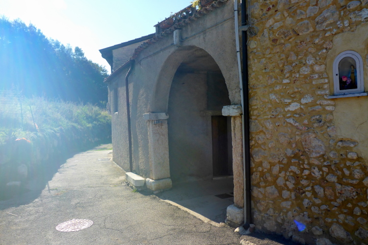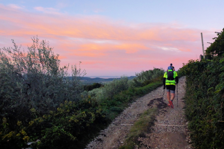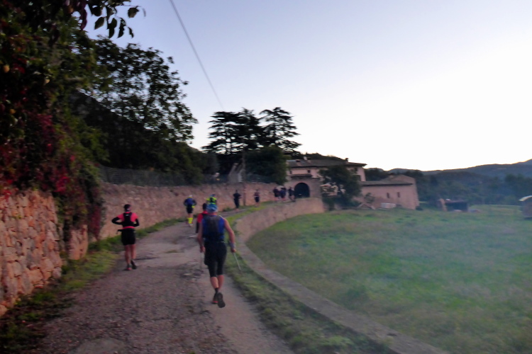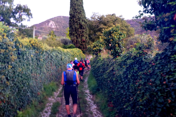 Pünktlich um sieben Uhr wird nach einer kurzen Streckenbeschreibung auf Italienisch und Englisch gestartet. Es ist jetzt einigermaßen hell. Wir laufen durch den Ort, der noch schläft. Die wenigen Passanten klatschen Beifall und wünschen uns alles Gute. Ich bleibe kurz für ein Foto stehen und schon bin ich Letzter. Zuerst auf schmalen Straßen, geht es schließlich auf kleinen Wegen zwischen Olivenbäumen hindurch, bis wir die letzten vereinzelten Häuser hinter uns lassen und in den Wald eintauchen. Der Boden ist noch nass vom Regen der letzten Tage, die Steigung ist moderat, von ein paar steilen Rampen abgesehen.