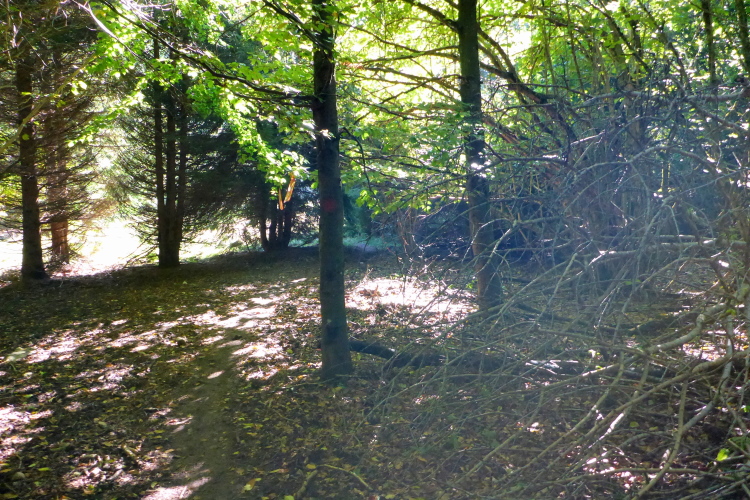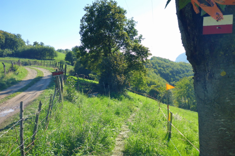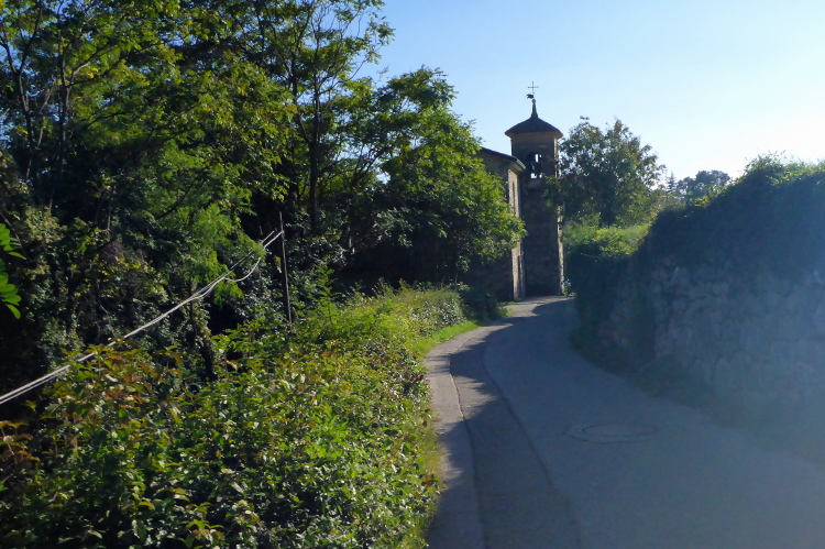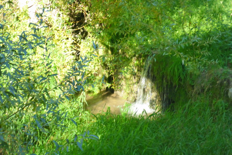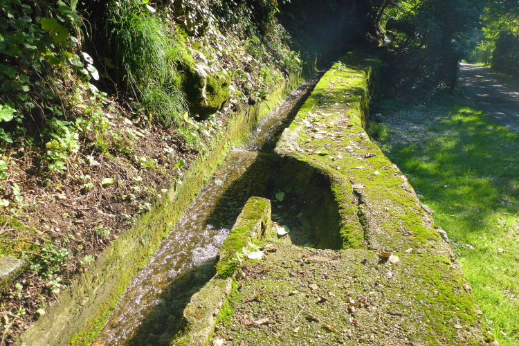 An der letzten Verpflegung nehme ich wieder ein Bier. Die gutgelaunte Truppe bietet mir auch noch einen Wein an. Ich will nicht unhöflich sein und nehme auch diesen. Noch ein Stückchen Käse und weiter geht es auf den letzten Abschnitt. Die Strecke verläuft jetzt recht flach, meist auf Fahrwegen oder angenehmen Wanderwegen durch den Wald. Einzelne Höfe kündigen Caprino an. Kleine Wasserfälle und eine Bewässerungsrinne bieten eine willkommene Erfrischung.
