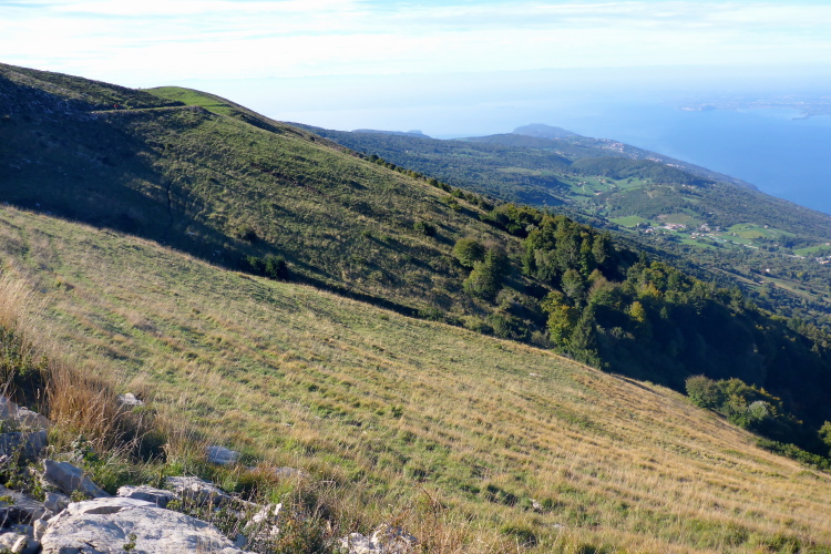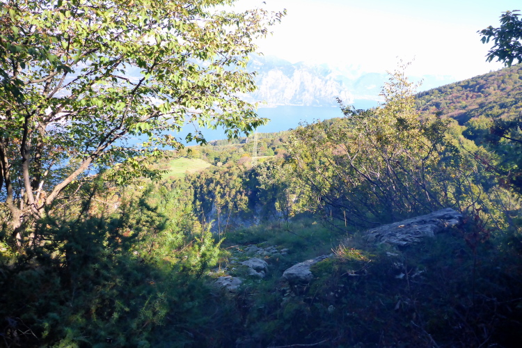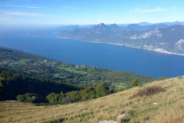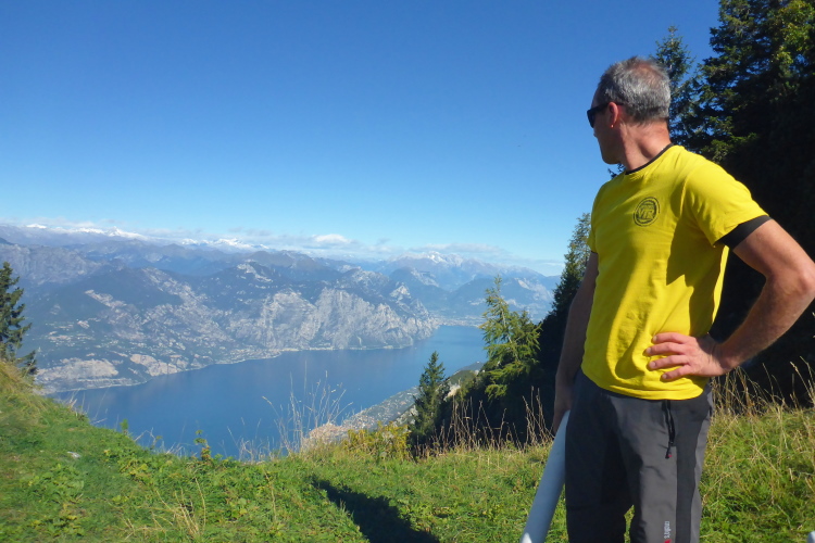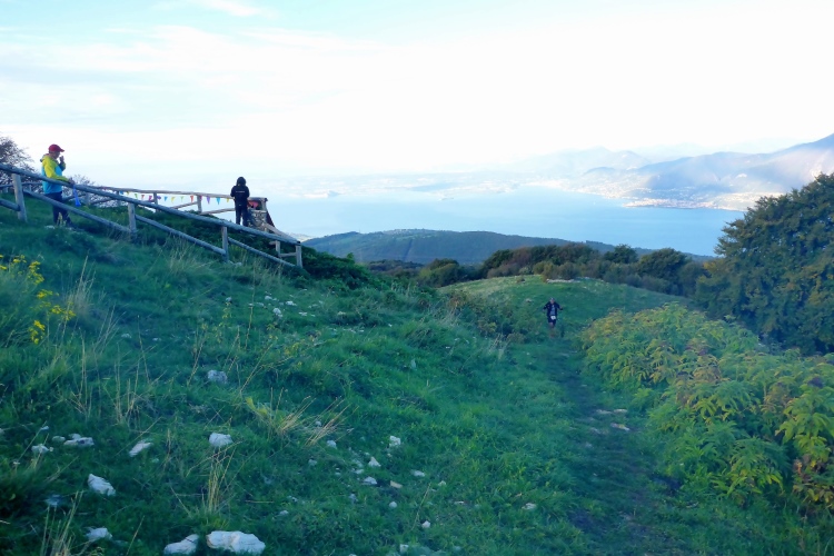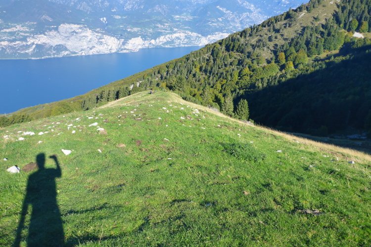 Wir laufen kurze Strecken auf Fahrwegen, um dann auf kleinen steilen Single Trails abzukürzen und schnell Höhe zu machen. Wir treffen immer wieder Jäger, die mit ihren Flinten darauf warten, dass die Hunde ihnen das Wild vor die Büchse treiben. Laufend hört man Schüsse und danach das Bellen der Hunde. Nach dem ersten Bergrücken fällt mein Blick auf den Gardasee, der ab jetzt links von uns der ständige Begleiter ist. Die Bäume sind in den Hintergrund getreten und wir durchqueren eine Weidelandschaft. Vor uns das Baldo-Massiv, im Westen die Bergdörfer oberhalb von Limone und im Norden der Alpenhauptkamm, der mit seinen weißen Bergspitzen zum Greifen nahe scheint. Ich kann im Aufstieg einige Plätze gut machen und bin froh, dass ich keinen Stress mit dem Cutoff habe. Zwölfeinhalb Stunden hat man Zeit für die 46 Kilometer.