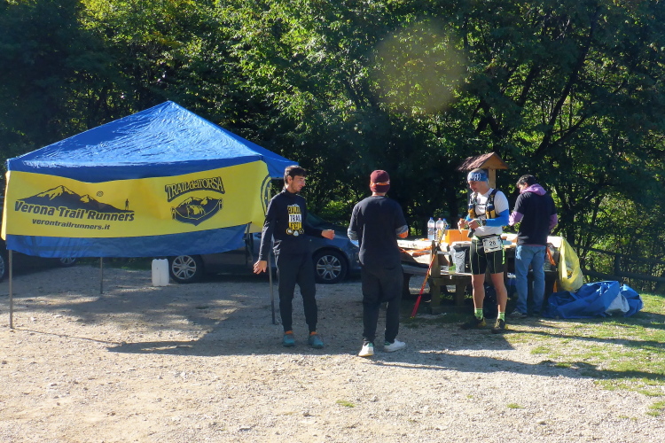 Ich genieße die sommerlichen Temperaturen, steht doch zu Hause bereits der kalte Winter vor der Tür. Ich sammele einen Läufer ein, der mit Krämpfen Probleme hat. Gemeinsam erreichen wir den Ort. Eine steile Treppe zwingt meinen Begleiter nochmal zu einer Dehnpause. Ein letzter Blick zurück auf das Monte Baldo Massiv und wir sind im Ziel. Meine Frau erwartet mich schon. Ich nehme noch ein Finisher-Bier und eine fabelhafte Portion hausgemachter Gnocchi. Als Finisher Präsent gibt es statt Medaille eine Startnummer, die von den Schulkindern hier gemalt wurde.