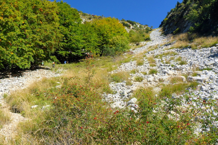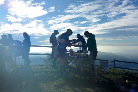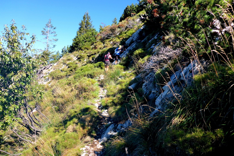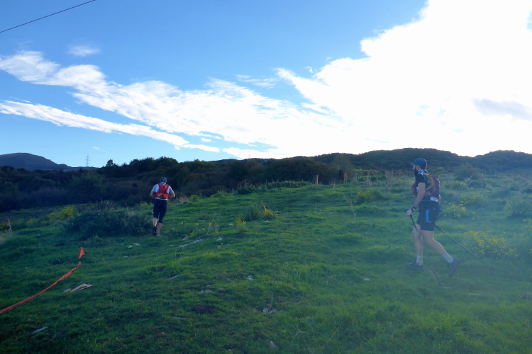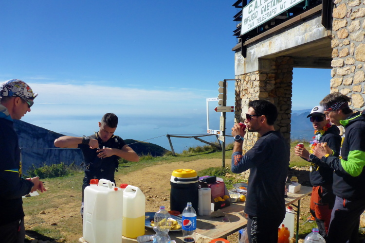 Schließlich treffen wir auf eine kleine schmale Straße. Gut gelaunt empfängt uns der Verpflegungsposten. Es ist jetzt richtig warm in der Sonne und so fülle ich meine Flaschen auf, kommt doch jetzt das Sahnestück. Mehr als 1000 Höhenmeter gilt es auf den nächsten 5 Kilometern zu erklimmen. Wir folgen ein Stück der Straße, um dann auf den Wanderweg zum Refugio und dem Cima Telegrafo abzubiegen. Es geht steil hoch. Wir kreuzen zu Anfang noch ein paarmal einen Fahrweg, dann geht es in Serpentinen über Geröll. Der Bewuchs wird jetzt spärlich. Die Sonne brennt in der windgeschützten Schlucht, deren Steilwand wir uns emporschrauben. Am Berg hören wir eine Glocke und Anfeuerungsrufe. Wir sind aber erst bei 550 Höhenmetern. Gut gelaunt schickt uns ein Streckenposten in die haarigste Passage des Rennens.