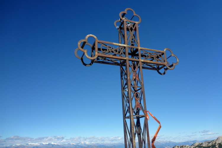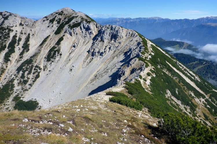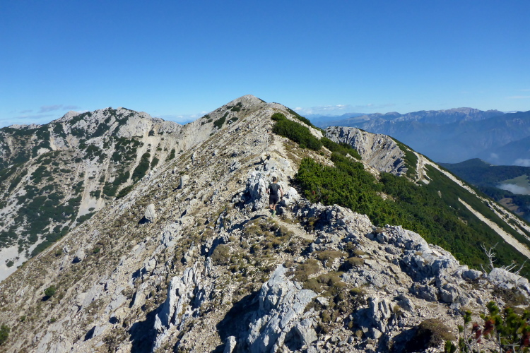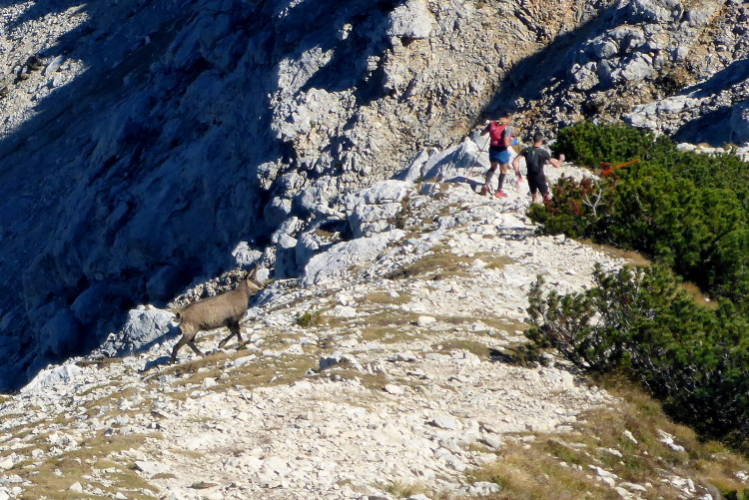 Am Gipfelkreuz habe ich den höchsten Punkt des Rennens mit 2200 Metern erreicht. Ein fantastisches Panorama umgibt mich. Die kalten Fallwinde aus dem Norden blasen mir heftig um die Ohren und es ist recht kalt, trotz Sonne. Unter mir sehe ich den weiteren Weg, der abenteuerlich einem Grat folgt. Etwas holprig geht es in den Windschatten. Eine Gämse kreuzt meinen Weg. Kurz bleibt sie stehen und schaut verdutzt auf die Eindringlinge. Wahrscheinlich wundert sie sich, warum die bunten Zweibeiner so umständliche Wege nehmen.