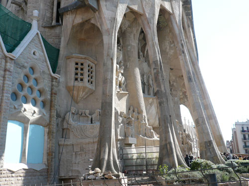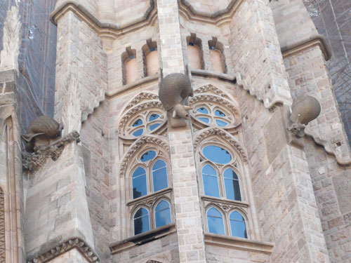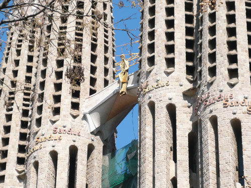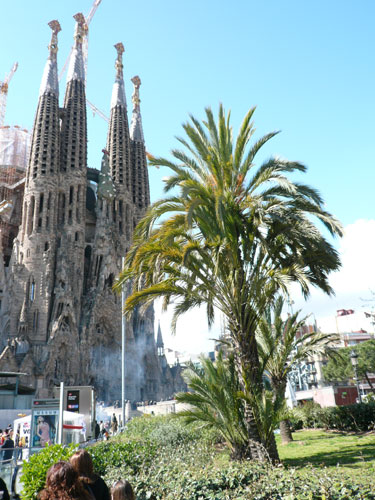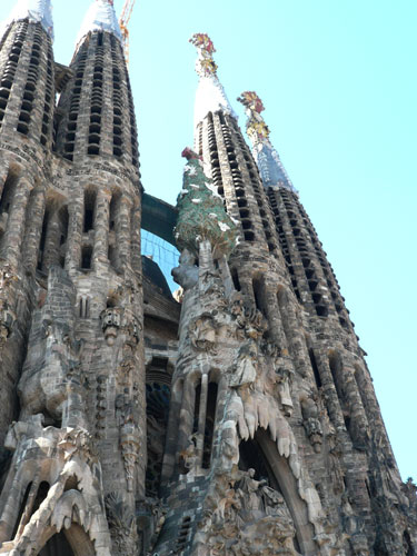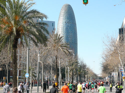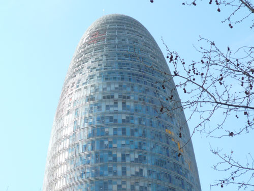 Von weitem schon seit längerem im Auge, können wir unmittelbar neben dem Plaça de les Glories Catalanes (KM 27) den 142 Meter hohen Torre Agbar aus nächster Nähe begutachten. Derzeit ist er das höchste Gebäude in der Stadt. Nur die Sagrada Familia wird einmal höher sein und das wird für alle Zeiten so bleiben, das ist in den Bauvorschriften von Barcelona so festgelegt.