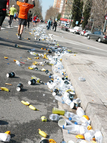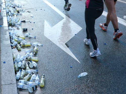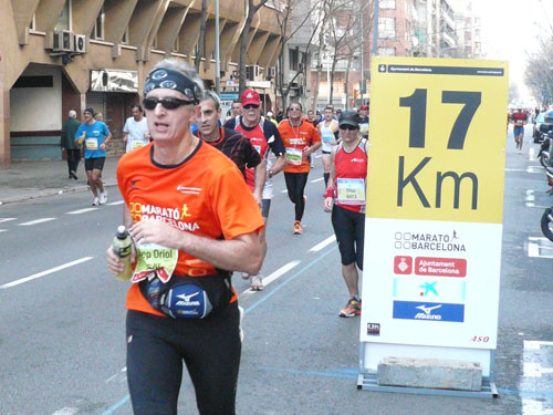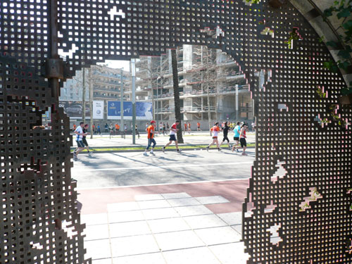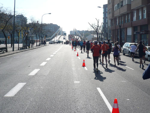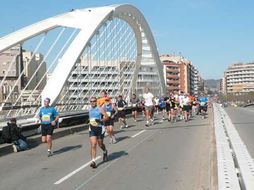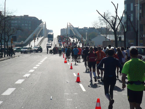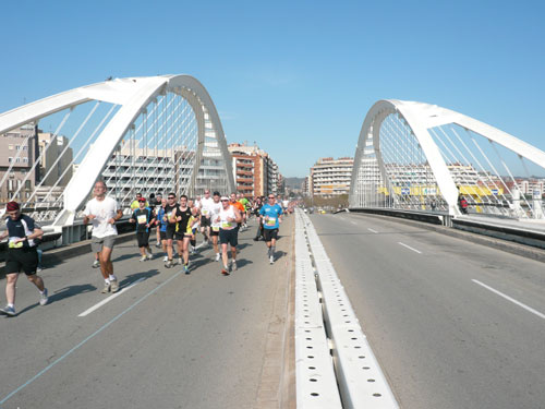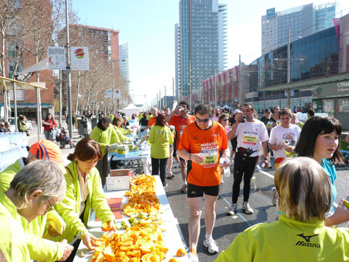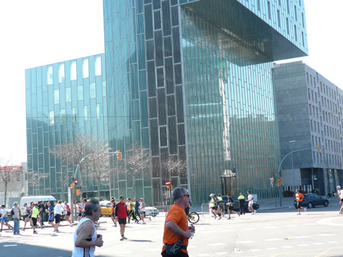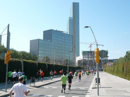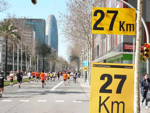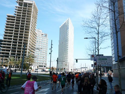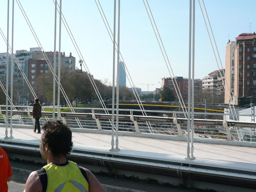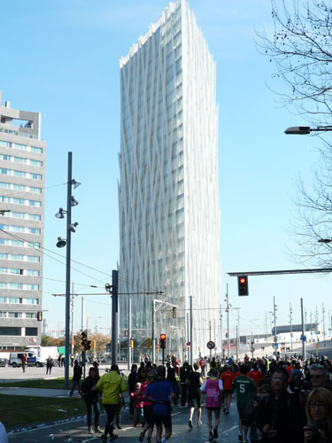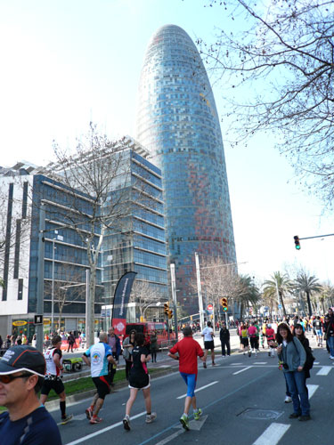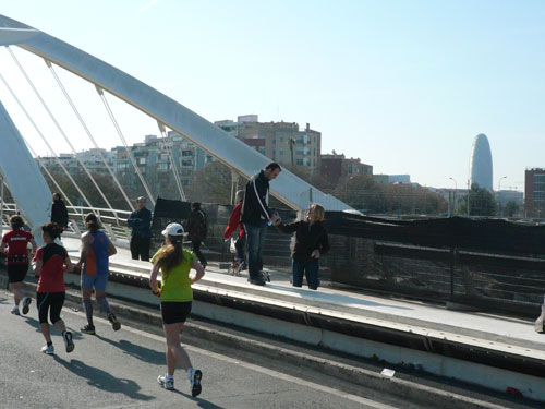 Die elegant geschwungene Brücke „Bac de Roda“ vom berühmten Architekten Santiago Calatrava überqueren wir bei KM 22. Ein Blick nach rechts auf dem Scheitelpunkt der Brücke zeigt mir schon vorab unser nächstes architektonisches Ziel, den „Torre Agbar“. Aber dorthin kommen wir nicht auf direktem Wege, erst führt uns der Kurs noch bis fast runter ans Meer, wo uns eine üppige ausgestattete VP-Station (KM 25) erwartet. Zu Wasser und Isogetränken gibt es noch Bananen, Äpfel und Orangen.
